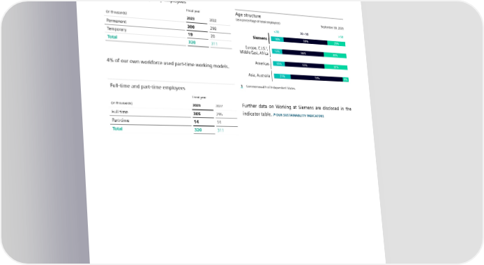 5.1 Working at Siemens Employment characteristics Changes in age distribution In fiscal 2023, 94% of our own workforce had permanent The distribution of employees by age group remained almost contracts. unchanged from the previous year. The average age in fiscal 2023 was 42 years. Permanent and temporary employees Fiscal year Age structure (in thousands) 2023 2022 (as a percentage of total employees) September 30, 2023 Permanent 300 290 < 30 30 – 50 > 50 Temporary 19 20 Siemens 16% 59% 25% Total 320 311 1 Europe, C.I.S. , 13% 56% 30% Middle East, Africa Americas 15% 53% 32% 4% of our own workforce used part-time working models. Asia, Australia 21% 71% 8% Full-time and part-time employees 1 Commonwealth of Independent States. Fiscal year (in thousands) 2023 2022 Further data on Working at Siemens are disclosed in the Full-time 305 295 indicator table. OUR SUSTAINABLITY INDICATORS Part-time 14 14 Total 320 311 SIEMENS SUSTAINABILITY REPORT 2023 88