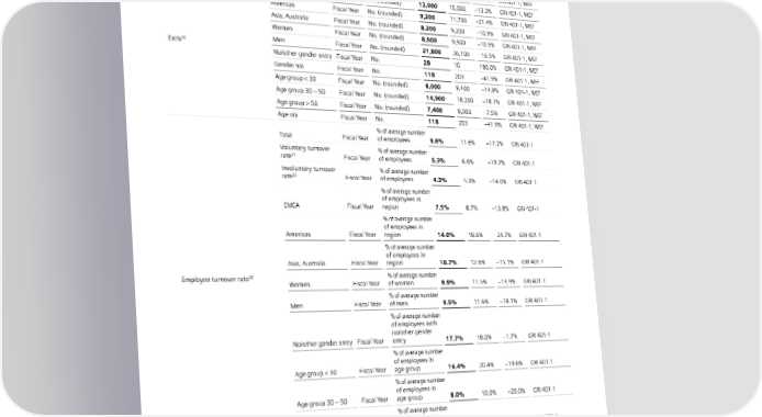 6 Our sustainability indicators Sustainability Key Performance Indicators Fiscal Year/ (KPIs) September 30th Unit FY 2023 FY 2022 +/– Standards Exits Total Fiscal Year No. (rounded) 30,400 35,800 −15.1% GRI 401-1, WEF EMEA Fiscal Year No. (rounded) 13,000 15,000 −13.3% GRI 401-1, WEF Americas Fiscal Year No. (rounded) 9,200 11,700 −21.4% GRI 401-1, WEF Asia, Australia Fiscal Year No. (rounded) 8,200 9,200 −10.9% GRI 401-1, WEF Women Fiscal Year No. (rounded) 8,500 9,500 −10.5% GRI 401-1, WEF 30 Men Fiscal Year No. (rounded) 21,800 26,100 −16.5% GRI 401-1, WEF Exits No/other gender entry Fiscal Year No. 28 10 180.0% GRI 401-1, WEF Gender n/a Fiscal Year No. 118 203 −41.9% GRI 401-1, WEF Age group < 30 Fiscal Year No. (rounded) 8,000 9,400 −14.9% GRI 401-1, WEF Age group 30 – 50 Fiscal Year No. (rounded) 14,900 18,200 −18.1% GRI 401-1, WEF Age group > 50 Fiscal Year No. (rounded) 7,400 8,000 −7.5% GRI 401-1, WEF Age n/a Fiscal Year No. 118 203 −41.9% GRI 401-1, WEF % of average number Total Fiscal Year of employees 9.6% 11.6% −17.2% GRI 401-1 Voluntary turnover % of average number rate31 Fiscal Year of employees 5.3% 6.6% −19.7% GRI 401-1 Involuntary turnover % of average number rate32 Fiscal Year of employees 4.3% 5.0% −14.0% GRI 401-1 % of average number of employees in EMEA Fiscal Year region 7.5% 8.7% −13.8% GRI 401-1 % of average number of employees in Americas Fiscal Year region 14.0% 18.6% −24.7% GRI 401-1 % of average number of employees in Asia, Australia Fiscal Year region 10.7% 12.6% −15.1% GRI 401-1 Employee turnover rate30 % of average number Women Fiscal Year of women 9.9% 11.5% −13.9% GRI 401-1 % of average number Men Fiscal Year of men 9.5% 11.6% −18.1% GRI 401-1 % of average number of employees with no/other gender No/other gender entry Fiscal Year entry 17.7% 18.0% −1.7% GRI 401-1 % of average number of employees in Age group < 30 Fiscal Year age group 16.4% 20.4% −19.6% GRI 401-1 % of average number of employees in Age group 30 – 50 Fiscal Year age group 8.0% 10.0% −20.0% GRI 401-1 % of average number of employees in Age group > 50 Fiscal Year age group 9.2% 10.1% −8.9% GRI 401-1 Employee share programs33 Employees participating in the Total (w/o SHS) Fiscal Year No. (rounded) 102,000 103,000 −1.0% Siemens employee share plans Total (w/o SHS) Fiscal Year % of total employees 43.5% 44.5% −2.2% 30 Turnover rate is defined as the ratio of voluntary and involuntary exits from Siemens during the fiscal year to the average number of employees. 31 Voluntary turnover rate is based on employee decision. 32 Involuntary turnover rate is based on other reasons, including dismissals, end of temporary contracts, mutual consent, (early) retirement, death, and other reasons that are not an employee decision. 33 Based on employees with eligibility to share plans. SIEMENS SUSTAINABILITY REPORT 2023 120