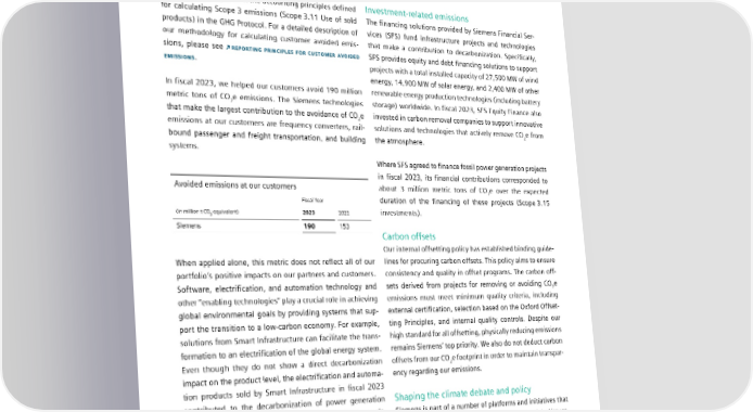 4.1 Climate action At Siemens we have developed our own method that meets indirect decarbonization impacts, we refrain from including our standards for high-quality and transparent metrics. We the avoided emissions from enabling technologies in our calculate the avoided emissions for all products and services overall customer avoided emissions total of 190 million sold and investments made by Siemens in each fiscal year metric tons of CO2e emissions. over the course of their entire use phase at our customers. This approach aligns with the accounting principles defined Investment-related emissions for calculating Scope 3 emissions (Scope 3.11 Use of sold The financing solutions provided by Siemens Financial Ser- products) in the GHG Protocol. For a detailed description of vices (SFS) fund infrastructure projects and technologies our methodology for calculating customer avoided emis- that make a contribution to decarbonization. Specifically, sions, please see REPORTING PRINCIPLES FOR CUSTOMER AVOIDED SFS provides equity and debt financing solutions to support EMISSIONS. projects with a total installed capacity of 27,500 MW of wind energy, 14,900 MW of solar energy, and 2,400 MW of other In fiscal 2023, we helped our customers avoid 190 million renewable energy production technologies (including battery metric tons of CO e emissions. The Siemens technologies storage) worldwide. In fiscal 2023, SFS Equity Finance also 2 that make the largest contribution to the avoidance of CO2e invested in carbon removal companies to support innovative emissions at our customers are frequency converters, rail- solutions and technologies that actively remove CO2e from bound passenger and freight transportation, and building the atmosphere. systems. Where SFS agreed to finance fossil power generation projects in fiscal 2023, its financial contributions corresponded to Avoided emissions at our customers about 3 million metric tons of CO e over the expected 2 Fiscal Year duration of the financing of these projects (Scope 3.15 (in million t CO -equivalent) 2023 2022 investments). 2 Siemens 190 153 Carbon offsets Our internal offsetting policy has established binding guide- When applied alone, this metric does not reflect all of our lines for procuring carbon offsets. This policy aims to ensure portfolio’s positive impacts on our partners and customers. consistency and quality in offset programs. The carbon off- Software, electrification, and automation technology and sets derived from projects for removing or avoiding CO e 2 other “enabling technologies” play a crucial role in achieving emissions must meet minimum quality criteria, including global environmental goals by providing systems that sup- external certification, selection based on the Oxford Offset- port the transition to a low-carbon economy. For example, ting Principles, and internal quality controls. Despite our solutions from Smart Infrastructure can facilitate the trans- high standard for all offsetting, physically reducing emissions formation to an electrification of the global energy system. remains Siemens’ top priority. We also do not deduct carbon Even though they do not show a direct decarbonization offsets from our CO2e footprint in order to maintain transpar- impact on the product level, the electrification and automa- ency regarding our emissions. tion products sold by Smart Infrastructure in fiscal 2023 contributed to the decarbonization of power generation Shaping the climate debate and policy systems by avoiding 4.6 million metric tons of CO e emis- Siemens is part of a number of platforms and initiatives that 2 sions. The description of our methodology for calculating allow us to participate in the debate on climate-related issues. these “enabling” customer avoided emissions can be found For example, as part of the UN Global Compact Peer-Learning in our REPORTING PRINCIPLES FOR CUSTOMER AVOIDED EMISSIONS. Group, we are sharing knowledge and lessons learned on However, because there is no recognized market standard various climate-related topics with other companies. for a calculation methodology to quantify these enabling or SIEMENS SUSTAINABILITY REPORT 2023 63