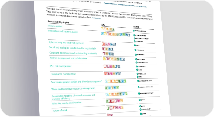 2.1 Materiality assessment Result of the materiality assessment and “Innovation and business model” were merged into one We identified 15 material sustainability topics of the greatest combined topic, “Innovation and business model.” relevance to Siemens from both perspectives. “Waste and hazardous substance management” and “Employee develop- The alignment of our material sustainability topics with the ment” were determined in fiscal 2023 to be two additional GRI framework and the SDGs can be found here: material topics. The two topics “Responsible governance” ANNEX GRI INDEX, ANNEX SUSTAINABLE DEVELOPMENT GOALS Siemens’ material sustainability topics are clearly linked to the United Nations’ Sustainability Development Goals (SDGs). They also serve as the basis for our considerations related to the DEGREE sustainability framework as well as our overall portfolio strategy and customer considerations. STRATEGY Sustainability topics SDGs DEGREE Climate action1 D ECARBONIZATION Innovation and business model D ECARBONIZATION R ESOURCE EFFICIENCY G OVERNANCE Cybersecurity and data management E THICS Social and ecological standards in the supply chain G OVERNANCE Corporate governance and sustainability leadership G OVERNANCE Partner management and collaboration G OVERNANCE D ECARBONIZATION ESG risk management G OVERNANCE E THICS Compliance management G OVERNANCE E THICS 1 Sustainable product design and lifecycle management R ESOURCE EFFICIENCY Waste and hazardous substance management R ESOURCE EFFICIENCY Sustainable handling of natural resources and R ESOURCE EFFICIENCY material efficiency Diversity, equity, and inclusion E QUITY Future of work E QUITY E MPLOYABILITY Employee development E QUITY E MPLOYABILITY Employee health and safety E MPLOYABILITY 1 Top 2 material sustainability topics. SIEMENS SUSTAINABILITY REPORT 2023 22