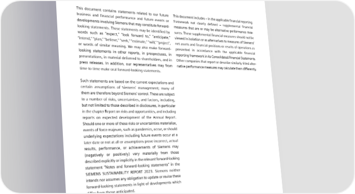 7.10 Notes and forwardlooking statements 7.10 Notes and forwardlooking statements This document contains statements related to our future This document includes – in the applicable financial reporting business and financial performance and future events or framework not clearly defined – supplemental financial developments involving Siemens that may constitute forward- measures that are or may be alternative performance mea- looking statements. These statements may be identified by sures. These supplemental financial measures should not be words such as “expect,” “look forward to,” “anticipate,” viewed in isolation or as alternatives to measures of Siemens’ “intend,” “plan,” “believe,” “seek,” “estimate,” “will,” “project”, net assets and financial positions or results of operations as or words of similar meaning. We may also make forward- presented in accordance with the applicable financial looking statements in other reports, in prospectuses, in reporting framework in its Consolidated Financial Statements. presentations, in material delivered to shareholders, and in Other companies that report or describe similarly titled alter- press releases. In addition, our representatives may from native performance measures may calculate them differently. time to time make oral forward-looking statements. Such statements are based on the current expectations and certain assumptions of Siemens’ management; many of them are therefore beyond Siemens’ control. These are subject to a number of risks, uncertainties, and factors, including, but not limited to those described in disclosures, in particular in the chapter Report on risks and opportunities, and including reports on expected development of the Annual Report. Should one or more of these risks or uncertainties materialize, events of force majeure, such as pandemics, occur, or should underlying expectations including future events occur at a later date or not at all or assumptions prove incorrect, actual results, performance, or achievements of Siemens may (negatively or positively) vary materially from those described explicitly or implicitly in the relevant forward-looking statement “Notes and forward-looking statements” in the SIEMENS SUSTAINABILITY REPORT 2023. Siemens neither intends nor assumes any obligation to update or revise these forward-looking statements in light of developments which differ from those anticipated. SIEMENS SUSTAINABILITY REPORT 2023 156