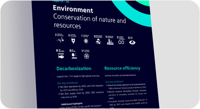 Pages 54 – 80 Environment Conservation of nature and resources Decarbonization Resource efficiency support the 1.5°C target to fight global warming achieve circularity and dematerialization 1 1 Our key ambitions Our key ambitions → Net Zero operations by 2030, with 55% reduction → Robust Eco Design approach to be implemented for by 2025 and 90% by 2030 100% of relevant Siemens product families by 2030 → Net Zero supply chain by 2050, 20% emissions → Natural resource decoupling through increased reduction by 2030 purchase of secondary materials for metals and resins Additional highlights → Circularity through waste-to-landfill reduction of 2 → Part of the EP100, EV100, and RE100 initiative 50% by 2025 and toward zero landfill waste by → Portfolio to support customers in climate protection 2030 → Disclosure of Taxonomy-eligible and Taxonomy- aligned revenues, capital expenditures, and operating Additional highlights expenditures → Assessment of our biodiversity footprint as founda- tion for further improvements → Improvements to energy efficiency as part of our Eco Efficiency @ Siemens target → Implementation of water strategy almost completed 1 Siemens without SHS. 2 Improving energy productivity (EP), use of electric vehicles (EV), and use of renewable energy (RE). SIEMENS SUSTAINABILITY REPORT 2023 54