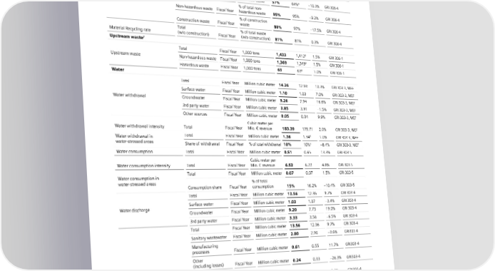 6 Our sustainability indicators Sustainability Key Performance Indicators Fiscal Year/ (KPIs) September 30th Unit FY 2023 FY 2022 +/– Standards Total % of total waste (w/o construction) Fiscal Year (w/o construction) 93% 93% −0.5% GRI 306-4 % of total Hazardous waste Fiscal Year hazardous waste 57% 64%4 −10.3% GRI 306-4 Recycling & Recovery rate % of total non- Non-hazardous waste Fiscal Year hazardous waste 95% 95% −0.2% GRI 306-4 % of construction Construction waste Fiscal Year waste 80% 97% −17.5% GRI 306-4 Total % of total waste Material Recycling rate (w/o construction) Fiscal Year (w/o construction) 81% 81% 0.3% GRI 306-4 Upstream waste7 8 Total Fiscal Year 1,000 tons 1,433 1,412 1.5% GRI 306-1 Upstream waste Non-hazardous waste Fiscal Year 1,000 tons 1,369 1,3498 1.5% GRI 306-1 Hazardous waste Fiscal Year 1,000 tons 63 638 1.0% GRI 306-1 Water Total Fiscal Year Million cubic meter 14.26 12.93 10.3% GRI 303-3, WEF Surface water Fiscal Year Million cubic meter 1.10 1.03 7.0% GRI 303-3, WEF Water withdrawal Groundwater Fiscal Year Million cubic meter 9.26 7.94 16.6% GRI 303-3, WEF 3rd party water Fiscal Year Million cubic meter 3.85 3.91 −1.5% GRI 303-3, WEF Other sources Fiscal Year Million cubic meter 0.05 0.04 9.9% GRI 303-3, WEF Cubic meter per Water withdrawal intensity Total Fiscal Year Mio. € revenue 183.39 179.71 2.0% GRI 303-3, WEF Water withdrawal in Total Fiscal Year Million cubic meter 1.36 1.344 1.0% GRI 303-3, WEF water-stressed areas Share of withdrawal Fiscal Year % of total withdrawal 10% 10%4 −8.4% GRI 303-3, WEF Water consumption Total Fiscal Year Million cubic meter 0.51 0.45 13.3% GRI 303-5 Cubic meter per Water consumption intensity Total Fiscal Year Mio. € revenue 6.52 6.22 4.8% GRI 303-5 Water consumption in Total Fiscal Year Million cubic meter 0.07 0.07 1.5% GRI 303-5 water-stressed areas % of total Consumption share Fiscal Year consumption 15% 16.2% −10.4% GRI 303-5 Total Fiscal Year Million cubic meter 13.56 12.36 9.7% GRI 303-4 Water discharge Surface water Fiscal Year Million cubic meter 1.03 1.07 −3.4% GRI 303-4 Groundwater Fiscal Year Million cubic meter 9.20 7.73 19.0% GRI 303-4 3rd party water Fiscal Year Million cubic meter 3.33 3.56 −6.5% GRI 303-4 Total Fiscal Year Million cubic meter 13.56 12.36 9.7% GRI 303-4 Sanitary wastewater Fiscal Year Million cubic meter 2.80 2.90 −3.6% GRI303-4 Manufacturing processes Fiscal Year Million cubic meter 0.61 0.55 11.7% GRI303-4 Other Discharge usage (including losses) Fiscal Year Million cubic meter 0.24 0.33 −26.3% GRI303-4 Cooling water dis- charged as wastewater Fiscal Year Million cubic meter 0.14 0.13 5.2% GRI303-4 Chemically unchanged cooling water (returned to receiving water body chemically unchanged, but warmed) Fiscal Year Million cubic meter 9.80 8.49 15.5% GRI303-4 4 Change in last year data caused by subsequent adjustment. 7 Analysis of our supply chain based on purchase data by using of a macroeconomic input-output-model also adjusted for inflation. 8 Change in last year data caused by new calculation method. SIEMENS SUSTAINABILITY REPORT 2023 113