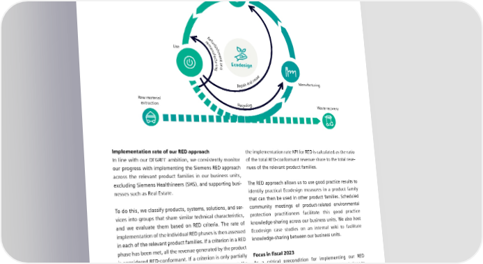 4.3 Product stewardship Siemens’ vision of an almost completely closed lifecycle when applying our RED approach Production Re r fu em rb Use an ishm u fa en c tu t r a gni dn Ecodesign e s eu r Manufacturing and ir a p e R Raw material R e g c lin y extraction c Waste recovery Implementation rate of our RED approach the implementation rate KPI for RED is calculated as the ratio In line with our DEGREE ambition, we consistently monitor of the total RED-conformant revenue share to the total reve- our progress with implementing the Siemens RED approach nues of the relevant product families. across the relevant product families in our business units, excluding Siemens Healthineers (SHS), and supporting busi- The RED approach allows us to use good practice results to nesses such as Real Estate. identify practical Ecodesign measures in a product family that can then be used in other product families. Scheduled To do this, we classify products, systems, solutions, and ser- community meetings of product-related environmental vices into groups that share similar technical characteristics, protection practitioners facilitate this good practice and we evaluate them based on RED criteria. The rate of knowledge-sharing across our business units. We also host implementation of the individual RED phases is then assessed Ecodesign case studies on an internal wiki to facilitate in each of the relevant product families. If a criterion in a RED knowledge-sharing between our business units. phase has been met, all the revenue generated by the product is considered RED-conformant. If a criterion is only partially Focus in fiscal 2023 met, 25% of the revenue is considered RED-conformant. If a As a critical precondition for implementing our RED criterion is not met, the corresponding revenue is disregarded. approach, we worked on developing automated solutions to calculate LCAs and generate EPDs in fiscal 2023. This aims to The RED implementation rate for each product family is then facilitate Ecodesign comparisons and the systematic use of determined by averaging the fulfillment levels of the individual LCAs and EPDs at Siemens. We also published an INTERNAL RED criteria. We calculate the revenue share of our RED-con- ON ECODESIGN to ensure alignment, increase transparency, and formant portfolio by multiplying the RED implementation accelerate knowledge generation on Ecodesign. rate with the revenues of the given product families. Lastly, SIEMENS SUSTAINABILITY REPORT 2023 74
