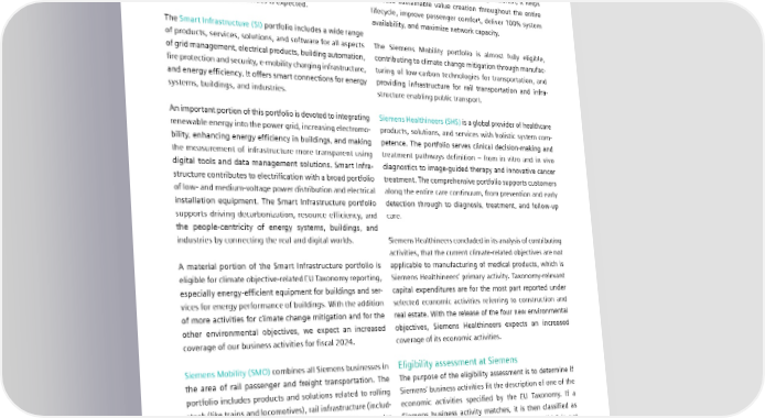 4.4 EU taxonomy The EU Taxonomy’s current eligibility rules for reporting on Siemens Mobility enables transportation operators around climate change mitigation and adaption cover the Digital the world to make their trains and infrastructure smart and Industries portfolio to a limited extent only. With the appli- electrified, and contributes to efficient, low-carbon transpor- cation of the four new environmental objectives for fiscal tation. Leveraging the advantages of digitalization, it helps 2024 and amendments to existing objectives, an increased increase sustainable value creation throughout the entire coverage of business activities is expected. lifecycle, improve passenger comfort, deliver 100% system availability, and maximize network capacity. The Smart Infrastructure (SI) portfolio includes a wide range of products, services, solutions, and software for all aspects The Siemens Mobility portfolio is almost fully eligible, of grid management, electrical products, building automation, contributing to climate change mitigation through manufac- fire protection and security, e-mobility charging infrastructure, turing of low-carbon technologies for transportation, and and energy efficiency. It offers smart connections for energy - providing infrastructure for rail transportation and infra systems, buildings, and industries. structure enabling public transport. An important portion of this portfolio is devoted to integrating Siemens Healthineers (SHS) is a global provider of healthcare renewable energy into the power grid, increasing electromo- products, solutions, and services with holistic system com- bility, enhancing energy efficiency in buildings, and making petence. The portfolio serves clinical decision-making and the measurement of infrastructure more transparent using treatment pathways definition – from in vitro and in vivo digital tools and data management solutions. Smart Infra- diagnostics to image-guided therapy and innovative cancer structure contributes to electrification with a broad portfolio treatment. The comprehensive portfolio supports customers of low- and medium-voltage power distribution and electrical along the entire care continuum, from prevention and early installation equipment. The Smart Infrastructure portfolio detection through to diagnosis, treatment, and follow-up supports driving decarbonization, resource efficiency, and care. the people-centricity of energy systems, buildings, and industries by connecting the real and digital worlds. Siemens Healthineers concluded in its analysis of contributing activities, that the current climate-related objectives are not A material portion of the Smart Infrastructure portfolio is applicable to manufacturing of medical products, which is eligible for climate objective-related EU Taxonomy reporting, Siemens Healthineers’ primary activity. Taxonomy-relevant especially energy-efficient equipment for buildings and ser- capital expenditures are for the most part reported under vices for energy performance of buildings. With the addition selected economic activities referring to construction and of more activities for climate change mitigation and for the real estate. With the release of the four new environmental other environmental objectives, we expect an increased objectives, Siemens Healthineers expects an increased coverage of our business activities for fiscal 2024. coverage of its economic activities. Siemens Mobility (SMO) combines all Siemens businesses in Eligibility assessment at Siemens the area of rail passenger and freight transportation. The The purpose of the eligibility assessment is to determine if portfolio includes products and solutions related to rolling Siemens’ business activities fit the description of one of the stock (like trains and locomotives), rail infrastructure (includ- economic activities specified by the EU Taxonomy. If a ing rail automation and electrification), and the service Siemens business activity matches, it is then classified as business, e.g., maintenance and digital services. Its offerings “eligible”. A business activity that is “non-eligible” is not comprise software solutions, like train planning systems, within the scope of the EU Taxonomy reporting. The eligibility Mobility-as-a-Service (Maas), reservation management and assessments were conducted decentrally in the businesses in ticketing, and a turnkey business that bundles consulting, an interdisciplinary manner involving experts, for instance planning, financing, constructing, servicing, and operating from technical, strategy, or sustainability departments. of complete mobility systems. SIEMENS SUSTAINABILITY REPORT 2023 77