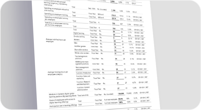6 Our sustainability indicators Sustainability Key Performance Indicators Fiscal Year/ (KPIs) September 30th Unit FY 2023 FY 2022 +/– Standards Professional education and lifelong learning Apprentices and dual students Total Sept. 30th No. (rounded) 5,800 5,500 5.5% GRI 2-7 Germany Sept. 30th No. (rounded) 3,600 3,900 −7.7% GRI 2-7 Average number of interns/(doctoral) students with an educational/ learning target (e.g. mandatory internship) Total Sept. 30th No. (rounded) 1,100 1,000 10.0% GRI 2-7 Spending on employee education and training Total Fiscal Year Million € 416.3 374.6 11.1% GRI 404-2, WEF Spending on employee training Total Fiscal Year Million € 237.0 205.4 15.4% GRI 404-2, WEF Spending on employee training per employee Total Fiscal Year € 753 667 12.9% GRI 404-2, WEF Spending on employee training per full time employee Total Fiscal Year € 763 676 12.8% GRI 404-2, WEF Total Fiscal Year No. 30 26 12.1% GRI 404-1, WEF Digital learning Fiscal Year No. 23 21 9.4% GRI 404-1, WEF On-site training Fiscal Year No. 6 5 23.1% GRI 404-1, WEF Average training hours per Women Fiscal Year No. 28 26 9.0% GRI 404-1, WEF employee Men Fiscal Year No. 30 27 13.1% GRI 404-1, WEF no/other gender Fiscal Year No. 18 39 −54.2% GRI 404-1, WEF Blue-collar workers Fiscal Year No. 22 20 12.0% GRI 404-1, WEF White-collar workers Fiscal Year No. 31 28 12.6% GRI 404-1, WEF Top management positions Fiscal Year No. 34 28 21.5% GRI 404-1, WEF Middle/junior man- agement positions Fiscal Year No. 36 28 26.6% GRI 404-1, WEF Non-management positions Fiscal Year No. 29 26 10.7% GRI 404-1, WEF Average training hours per Function: Production Fiscal Year No. 30 27 12.6% GRI 404-1, WEF employee category Function: Sales and marketing Fiscal Year No. 27 24 10.7% GRI 404-1, WEF Function: Research and development Fiscal Year No. 31 27 16.7% GRI 404-1, WEF Function: General administration Fiscal Year No. 27 24 12.8% GRI 404-1, WEF Modules in Siemens digital global learning platform My Learning World Total (w/o SHS) Fiscal Year No. (rounded) 136,000 116,600 –16.6% GRI 404-2, WEF Share of employees with access to digital learning offerings Total Fiscal Year % of total employees 99.6% 90% 10.7% GRI 404-2, WEF Participation rate in learning offerings Total Fiscal Year % of total employees 100% 100% 0.0% GRI 404-2, WEF Development programs Siemens Core Learning Paths (CLP) Total Fiscal Year No. 29 29 0.0% GRI 404-2, WEF Siemens Potential Development Programs (PDP) Total (w/o SHS) Fiscal Year No. 38 36 5.6% GRI 404-2, WEF Xcelerate Your Potential @ Siemens Total community Sept. 30th No. 23 22 4.5% GRI 404-2, WEF (XPS) Active participants (w/o SHS) Sept. 30th No. 3 2 50.0% GRI 404-2, WEF Siemens Finance Excellence Total community Sept. 30th No. 69 68 1.5% GRI 404-2, WEF Program (FEP) Active participants Sept. 30th No. 8 9 –11.1% GRI 404-2, WEF SIEMENS SUSTAINABILITY REPORT 2023 121