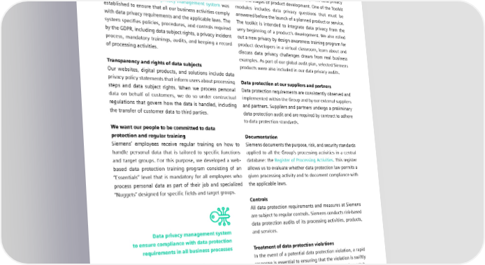 3.4 Cybersecurity and data privacy Actions and results Assessing and fostering our privacy by design processes was a key focus area in fiscal 2023. Privacy by design at Siemens Siemens’ data privacy management system is supported by our Privacy by Design Toolkit, a software To put our data privacy measures into action throughout the solution that helps process owners incorporate data privacy Group, Siemens has made them an integral part of our com- in all the stages of product development. One of the Toolkit pliance system. Our data privacy management system was modules includes data privacy questions that must be established to ensure that all our business activities comply answered before the launch of a planned product or service. with data privacy requirements and the applicable laws. The The toolkit is intended to integrate data privacy from the system specifies policies, procedures, and controls required very beginning of a product’s development. We also rolled by the GDPR, including data subject rights, a privacy incident out a new privacy by design awareness training program for process, mandatory trainings, audits, and keeping a record product developers in a virtual classroom, learn about and of processing activities. discuss data privacy challenges drawn from real business examples. As part of our global audit plan, selected Siemens Transparency and rights of data subjects products were also included in our data privacy audits. Our websites, digital products, and solutions include data privacy policy statements that inform users about processing Data protection at our suppliers and partners steps and data subject rights. When we process personal Data protection requirements are consistently observed and data on behalf of customers, we do so under contractual implemented within the Group and by our external suppliers regulations that govern how the data is handled, including and partners. Suppliers and partners undergo a preliminary the transfer of customer data to third parties. data protection audit and are required by contract to adhere to data protection standards. We want our people to be committed to data protection and regular training Documentation Siemens’ employees receive regular training on how to Siemens documents the purpose, risk, and security standards handle personal data that is tailored to specific functions applied to all the Group’s processing activities in a central and target groups. For this purpose, we developed a web- database: the Register of Processing Activities. This register based data protection training program consisting of an allows us to evaluate whether data protection law permits a “Essentials” level that is mandatory for all employees who given processing activity and to document compliance with process personal data as part of their job and specialized the applicable laws. “Nuggets” designed for specific fields and target groups. Controls All data protection requirements and measures at Siemens are subject to regular controls. Siemens conducts risk-based data protection audits of its processing activities, products, Data privacy management system and services. to ensure compliance with data protection requirements in all business processes Treatment of data protection violations In the event of a potential data protection violation, a rapid Data protection in our products and solutions response is essential to ensuring that the violation is swiftly (privacy by design) stopped and corrected. To facilitate this, Siemens has estab- Siemens wants to ensure that its products and solutions can be lished a global Data Privacy Incident Process that uses central used in compliance with all relevant data protection rules. At reporting channels and aims to immediately inform all Siemens, privacy by design means that compliance with the internal and external stakeholders (including the data law, transparency, informational self-determination, data subjects and regulatory authorities). minimization, and data security are already applied when products and services are developed. Therefore, privacy by design is integrated into our product development processes. SIEMENS SUSTAINABILITY REPORT 2023 53