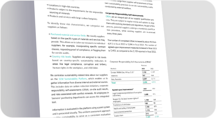 3.3 Sustainable supply chain practices The supplier management process at Siemens incorporates Self-assessments and site audits as control strict criteria for supplier selection and qualification. When mechanisms engaging with new suppliers, we categorize and if necessary Based on the risk categories, we conduct appropriate evalu- proactively address potential sustainability risks based on ations of suppliers in accordance with our risk assessment. these criteria. This may apply to suppliers exhibiting the These reviews range from supplier self-assessments of their following risk characteristics: own sustainability practices to on-site sustainability audits conducted by external auditors. → Locations in high-risk countries → Products subject to the requirements for the responsible Corporate Responsibility SelfAssessments sourcing of minerals CRSAs are an integral part of our supplier qualification pro- → Products and services with large carbon footprints cess. They are subject to regular review and updates to align them with evolving standards and regulations. As part of this To identify these risk characteristics, we categorize our process, potential suppliers undergo a mandatory qualifica- suppliers as follows: tion procedure, while existing suppliers are re-assessed every three years. → Purchased material and service fields: We classify suppliers based on the specific types of materials and services they The number of completed CRSAs increased by about 4% from provide. This allows us to tailor our measures to individual 4,912 in fiscal 2022 to 5,096 in fiscal 2023. The number of suppliers: for example, incorporating specific contract agreed-upon improvement measures increased in fiscal 2023 clauses, requesting proof of compliance, or flagging them to 5,493, as compared to the 3,109 reported in fiscal 2022. for on-site audits. → Country risk levels: Suppliers are assigned to risk levels based on country-specific sustainability indicators in Corporate Responsibility Self-Assessments (CRSA)¹ areas like legal compliance, corruption and bribery, Fiscal year human rights in the workplace, and child labor. (Number) 2023 2022 Europe, Middle East, Africa, C.I.S.² 1,122 1,147 We centralize sustainability-related data about our suppliers Americas 767 654 on the SCM Sustainability Platform, which enables us to Asia, Australia 3,207 3,111 gather information from diverse internal and external sources. Total 5,096 4,912 This includes data on carbon reduction initiatives, corporate responsibility self-assessments (CRSA), on-site audit results, Agreed upon improvement³ 2023 2022 and risks associated with conflict minerals. All employees in Legal Compliance/prohibition of corruption Siemens’ purchasing departments can access this integrated and bribery 1,698 915 tool. Respect for the basic human rights of employees 1,194 564 Information is evaluated in the platform using a point system Prohibition of child labor 168 80 and is presented visually. This uniform assessment approach Health and safety of employees 1,103 879 enables sustainability to serve as a consistent evaluation Environmental protection 1,116 546 factor throughout Siemens. It supports and complements Supply chain 214 125 local purchasing decisions with globally available supplier Total 5,493 3,109 sustainability information. 1 Self-assessments completed mainly by suppliers from non-OECD countries with a purchasing volume of > €50,000 per year. Questionnaires that were initiated, completed, and concluded in the reporting period. 2 Commonwealth of Independent States. 3 Improvement measures agreed on with suppliers relate either to actual deviations from the Supplier Code of Conduct, structural improvements in management systems, or a lack of specific processes and guidelines implemented by the supplier. SIEMENS SUSTAINABILITY REPORT 2023 46