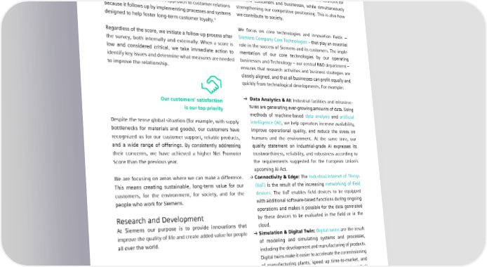 1.2 Company profile Siemens’ systematic evaluation draws from customer satisfac- Innovation strengthens Siemens and its tion surveys conducted annually worldwide. The score itself customers is based on a single question: “How likely is it that you would Our Research and Development (R&D) activities are geared recommend Siemens to a colleague or business partner?” towards developing innovative and sustainable solutions for Siemens’ customers and businesses, while simultaneously The survey pursues a holistic approach to customer relations strengthening our competitive positioning. This is also how because it follows up by implementing processes and systems we contribute to society. 4 designed to help foster long-term customer loyalty. We focus on core technologies and innovation fields – Regardless of the score, we initiate a follow-up process after Siemens Company Core Technologies – that play an essential the survey, both internally and externally. When a score is role in the success of Siemens and its customers. The imple- low and considered critical, we take immediate action to mentation of our core technologies by our operating identify key issues and determine what measures are needed businesses and Technology – our central R&D department – to improve the relationship. ensures that research activities and business strategies are closely aligned, and that all businesses can profit equally and quickly from technological developments. For example: Our customers’ satisfaction → Data Analytics & AI: Industrial facilities and infrastruc- is our top priority tures are generating ever-growing amounts of data. Using methods of machine-based data analysis and artificial Despite the tense global situation (for example, with supply intelligence (AI), we help operators increase availability, bottlenecks for materials and goods), our customers have improve operational quality, and reduce the stress on recognized us for our customer support, reliable products, humans and the environment. At the same time, our and a wide range of offerings. By consistently addressing quality statement on industrial-grade AI expresses its their concerns, we have achieved a higher Net Promoter trustworthiness, reliability, and robustness according to Score than the previous year. the requirements suggested for the European Union’s upcoming AI Act. We are focusing on areas where we can make a difference. → Connectivity & Edge: The Industrial Internet of Things This means creating sustainable, long-term value for our (IIoT) is the result of the increasing networking of field customers, for the environment, for society, and for the devices. The IIoT enables field devices to be equipped people who work for Siemens. with additional software-based functions during ongoing operations and makes it possible for the data generated Research and Development by these devices to be evaluated in the field or in the At Siemens our purpose is to provide innovations that cloud. improve the quality of life and create added value for people → Simulation & Digital Twin: Digital twins are the result all over the world. of modeling and simulating systems and processes, including the development and manufacturing of products. Digital twins make it easier to accelerate the commissioning of manufacturing plants, speed up time-to-market, and improve the operation of infrastructures throughout their lifecycles. 4 In most cases, the survey questions are focused on the business unit level. However, the overall score can be aggregated up to the business level and to the level of the entire company. SIEMENS SUSTAINABILITY REPORT 2023 13