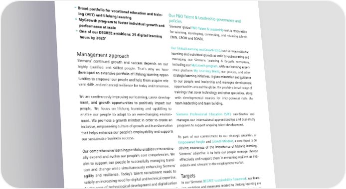 5.3 Professional education and lifelong learning 5.3 Professional education and lifelong learning – Broad portfolio for vocational education and train Our P&O Talent & Leadership governance and ing (VET) and lifelong learning policies – MyGrowth program to foster individual growth and Siemens’ global P&O Talent & Leadership unit is responsible performance at scale for winning, developing, connecting, and retaining talents – One of our DEGREE ambitions: 25 digital learning (WIN, GROW and BOND). 1 hours by 2025 Our Global Learning and Growth (GLG) unit is responsible for learning and individual growth at scale by orchestrating and Management approach managing our Siemens Learning & Growth ecosystem, Siemens’ continued growth and success depends on our including our MyGrowth program, with our learning experi- highly qualified and skilled people. That’s why we have ence platform My Learning World, our policies, and other developed an extensive portfolio of lifelong learning oppor- strategic learning initiatives. It gives orientation and guidance tunities to empower our people and help them acquire rele- to our people and leadership and manages development vant skills and enhanced resilience for today and tomorrow. opportunities around the globe. We provide a broad range of trainings that cover technology and other specialties, along We are continuously improving our learning, career develop- with developmental courses for inter-personal skills like ment, and growth opportunities to positively impact our team leadership and team building. people. We focus on lifelong learning and upskilling to - Siemens Professional Education (SPE) coordinates and enable our people to adapt to an ever-changing environ ment. We promote a growth mindset in order to create an manages our international apprenticeships and dual-study inclusive, empowering culture of growth and transformation programs to support ongoing talent development. that helps enhance our people’s employability and supports our sustainable business success. As part of our commitment to our strategic priorities of Empowered People and Growth Mindset, a core focus is on Our comprehensive learning portfolio enables us to continu- driving awareness of the importance of lifelong learning. ally expand and evolve our people’s core competencies. We Siemens’ objective is to help our people manage change aim to support our people in successfully managing transi- effectively and support them in remaining resilient as indi- tion and change while simultaneously enhancing Siemens’ viduals and relevant to the employment market. agility and resilience. Today’s talent recruitment needs to satisfy an increasing need for digital and technical expertise. Targets As the pace of technological development and digitalization In our Siemens DEGREE sustainability framework, our learn- reduces the half-life of expertise, continuous learning and ing ambition and measures related to lifelong learning are upskilling is fundamental to Siemens’ continuing success. embedded in Employability, one of the six fields of action, in order to encourage our people’s resilience.1 Our ongoing investments in vocational education and train- ing (VET) and talent-entry programs also help us attract and retain talents. 1 Siemens without SHS. SIEMENS SUSTAINABILITY REPORT 2023 93