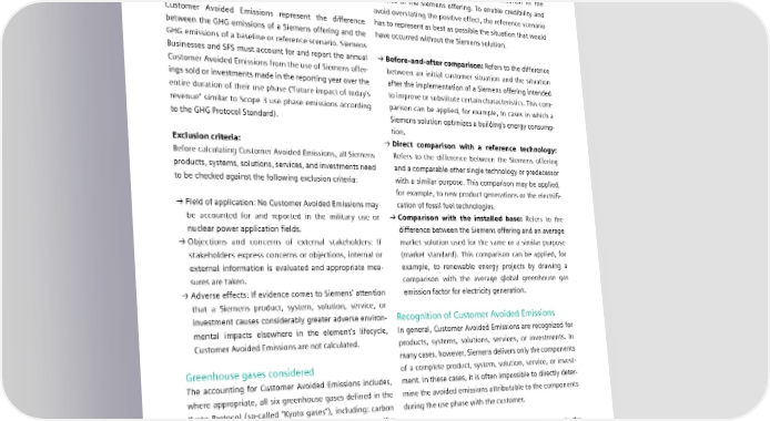 7.2 Reporting principles for Customer Avoided Emissions Accounting for Customer Avoided Emissions Baseline methodology All Siemens Businesses and SFS are required to report the The baseline methodology defined in the guideline refers to Customer Avoided Emissions for all products, systems, solu- the comparison of a Siemens product, system, solution, tions, services, or investments that lead to the avoidance of service, or investment with a reference situation in the GHG emissions during the customer use phase. absence of the Siemens offering. To enable credibility and avoid overstating the positive effect, the reference scenario Customer Avoided Emissions represent the difference has to represent as best as possible the situation that would between the GHG emissions of a Siemens offering and the have occurred without the Siemens solution. GHG emissions of a baseline or reference scenario. Siemens Businesses and SFS must account for and report the annual → Beforeandafter comparison: Refers to the difference Customer Avoided Emissions from the use of Siemens offer- between an initial customer situation and the situation ings sold or investments made in the reporting year over the after the implementation of a Siemens offering intended entire duration of their use phase (“future impact of today’s to improve or substitute certain characteristics. This com- revenue” similar to Scope 3 use phase emissions according parison can be applied, for example, to cases in which a to the GHG Protocol Standard). Siemens solution optimizes a building’s energy consump- tion. Exclusion criteria: → Direct comparison with a reference technology: Before calculating Customer Avoided Emissions, all Siemens Refers to the difference between the Siemens offering products, systems, solutions, services, and investments need and a comparable other single technology or predecessor to be checked against the following exclusion criteria: with a similar purpose. This comparison may be applied, for example, to new product generations or the electrifi- → Field of application: No Customer Avoided Emissions may cation of fossil fuel technologies. be accounted for and reported in the military use or → Comparison with the installed base: Refers to the nuclear power application fields. difference between the Siemens offering and an average → Objections and concerns of external stakeholders: If market solution used for the same or a similar purpose stakeholders express concerns or objections, internal or (market standard). This comparison can be applied, for - external information is evaluated and appropriate mea example, to renewable energy projects by drawing a sures are taken. comparison with the average global greenhouse gas → Adverse effects: If evidence comes to Siemens’ attention emission factor for electricity generation. that a Siemens product, system, solution, service, or investment causes considerably greater adverse environ- Recognition of Customer Avoided Emissions mental impacts elsewhere in the element’s lifecycle, In general, Customer Avoided Emissions are recognized for Customer Avoided Emissions are not calculated. products, systems, solutions, services, or investments. In many cases, however, Siemens delivers only the components Greenhouse gases considered of a complete product, system, solution, service, or invest- The accounting for Customer Avoided Emissions includes, ment. In these cases, it is often impossible to directly deter- where appropriate, all six greenhouse gases defined in the mine the avoided emissions attributable to the components Kyoto Protocol (so-called “Kyoto gases”), including: carbon during the use phase with the customer. dioxide (CO2), methane (CH4), nitrous oxide (N2O), sulfur hexafluoride (SF ), hydrofluorocarbons (HFCs), and perfluo- Therefore, Siemens Businesses and SFS need to apply the 6 rocarbons (PFCs). following rules when accounting for and reporting Customer Avoided Emissions: To assess the relevance of GHG emissions other than CO2, they are converted into metric tons of CO equivalents → Siemens supplies the entire product, system, solution, 2 (CO2e). This number is based on the global warming potential service, or investment: Siemens accounts for 100% of the over 100 years of the respective greenhouse gas compared Customer Avoided Emissions during the customer use to the global warming potential of CO . phase. 2 SIEMENS SUSTAINABILITY REPORT 2023 129