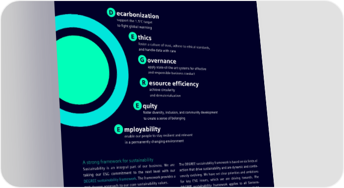 1.1 Our DEGREE sustainability framework sets clear and measurable ambitions 1.1 Our DEGREE sustainability framework sets measurable ambitions D ecarbonization support the 1.5°C target to fight global warming E thics foster a culture of trust, adhere to ethical standards, and handle data with care G overnance apply state-of-the-art systems for effective and responsible business conduct R esource efficiency achieve circularity and dematerialization E quity foster diversity, inclusion, and community development to create a sense of belonging E mployability enable our people to stay resilient and relevant in a permanently changing environment A strong framework for sustainability Sustainability is an integral part of our business. We are The DEGREE sustainability framework is based on six fields of taking our ESG commitment to the next level with our action that drive sustainability and are dynamic and contin- DEGREE sustainability framework. The framework provides a uously evolving. We have set clear priorities and ambitions 360-degree approach to our core sustainability values. for key ESG issues, which we are driving towards. The DEGREE sustainability framework applies to all Siemens- By addressing the three aspects of ESG, we are building a affiliated companies, excluding Siemens Healthineers (SHS). better future that helps us to However, the sustainability approach at SHS follows the same basic principles, which reflects our expectations as its →Stay within the planetary boundaries; majority shareholder. →Foster a culture of trust, empowerment, and growth; →Support inclusive economic opportunities; →Ensure that our people and businesses remain resilient and relevant for the future. SIEMENS SUSTAINABILITY REPORT 2023 8