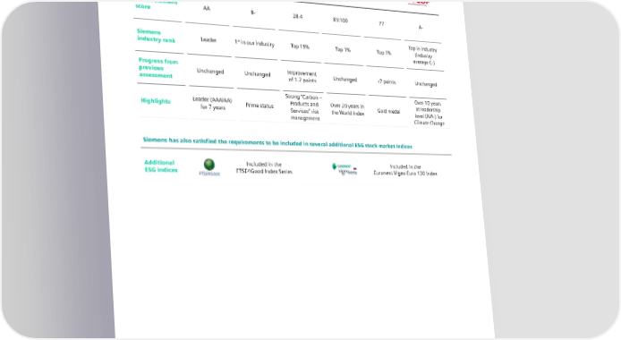 2.4 Sustainability ratings reflect our performance Siemens’ sustainability performance has received high recognition in external ratings External sustainability ratings Latest Siemens AA B- 28.4 81/100 77 A- score Siemens Top in industry st industry rank Leader 1 in our industry Top 15% Top 1% Top 1% (industry average C-) Progress from Improvement previous Unchanged Unchanged of 1.7 points Unchanged +7 points Unchanged assessment Strong “Carbon – Over 10 years Highlights Leader (AAA/AA) Prime status Products and Over 20 years in Gold medal at leadership for 7 years Services” risk the World Index level (A/A-) for management Climate Change Siemens has also satisfied the requirements to be included in several additional ESG stock market indices Additional Included in the Included in the ESG indices FTSE4Good Index Series Euronext Vigeo Euro 120 Index SIEMENS SUSTAINABILITY REPORT 2023 30