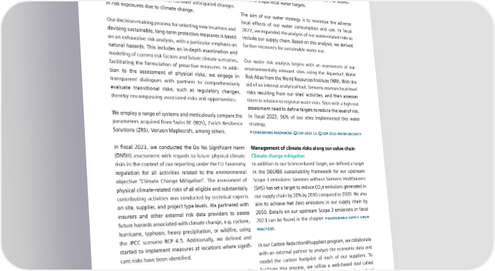 7.4 Task Force on ClimateRelated Financial Disclosures (TCFD) Furthermore, during this fiscal year, we conducted compre- We establish water targets at multiple sites to account for hensive global training sessions, featuring the participation the specific local environment and to drive effective mitiga- of qualified external specialists, aimed at strengthening our tion measures. At the corporate level, we have implemented business continuity management and standardizing our a defined water strategy, and have conducted risk assess- business impact analysis, particularly in the context of natural ments to shape local water targets. hazards. These initiatives also consider anticipated changes in risk exposures due to climate change. The aim of our water strategy is to minimize the adverse local effects of our water consumption and use. In fiscal Our decision-making process for selecting new locations and 2022, we expanded the analysis of our water-related risks to devising sustainable, long-term protective measures is based include our supply chain. Based on this analysis, we derived on an exhaustive risk analysis, with a particular emphasis on further measures for sustainable water use. natural hazards. This includes an in-depth examination and modeling of current risk factors and future climate scenarios, Our water risk analysis begins with an assessment of our facilitating the formulation of proactive measures. In addi- environmentally relevant sites using the Aqueduct Water tion to the assessment of physical risks, we engage in Risk Atlas from the World Resources Institute (WRI). With the transparent dialogues with partners to comprehensively aid of an internal analytical tool, Siemens assesses local-level evaluate transitional risks, such as regulatory changes, risks resulting from our sites’ activities, and then assesses thereby encompassing associated risks and opportunities. them in relation to regional water risks. Sites with a high-risk assessment need to define targets to reduce the level of risk. We employ a range of systems and meticulously compare the In fiscal 2023, 96% of our sites implemented this water parameters acquired from Swiss RE (RDS), Zurich Resilience strategy. Solutions (ZRS), Verizon Maplecroft, among others. CONSERVING RESOURCES, CDP 2023 C2, CDP 2023 WATER SECURITY In fiscal 2023, we conducted the Do No Significant Harm Management of climate risks along our value chain (DNSH) assessment with regards to future physical climate Climate change mitigation risks in the context of our reporting under the EU Taxonomy In addition to our Science-Based Target, we defined a target regulation for all activities related to the environmental in the DEGREE sustainability framework for our upstream objective “Climate Change Mitigation”. The assessment of Scope 3 emissions: Siemens without Siemens Healthineers physical climate-related risks of all eligible and substantially (SHS) has set a target to reduce CO e emissions generated in 2 contributing activities was conducted by technical experts our supply chain by 20% by 2030 compared to 2020. We also on site, supplier, and project type levels. We partnered with aim to achieve Net Zero emissions in our supply chain by insurers and other external risk data providers to assess 2050. Details on our upstream Scope 3 emissions in fiscal future hazards associated with climate change, e.g. cyclone, 2023 can be found in the chapter SUSTAINABLE SUPPLY CHAIN hurricane, typhoon, heavy precipitation, or wildfire, using PRACTICES. the IPCC scenario RCP 4.5. Additionally, we defined and - In our Carbon Reduction@Suppliers program, we collaborate started to implement measures at locations where signifi cant risks have been identified. with an external partner to analyze the economic data and model the carbon footprint of each of our suppliers. To Climate change is also having an impact on water supply. facilitate this process, we utilize a web-based tool called Water is one of humanity’s most important resources. For supplier+s that highlights the main sources of suppliers’ this reason, Siemens has been analyzing water scarcity, CO2e emissions and provides guidance on how to reduce water pollution, local fire risks, climate change, and flooding them. Once suppliers have completed the learning phase, and precipitation patterns at our sites for several years. We they provide us with their primary data through the tool. consider these analyses in our business decisions: for example, CONSERVING RESOURCES, SUSTAINABLE SUPPLY CHAIN PRACTICES when we select the location for a new site or implement precautionary measures. SIEMENS SUSTAINABILITY REPORT 2023 141