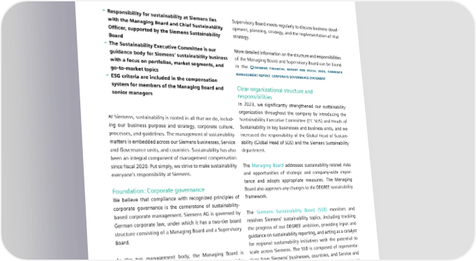 2.2 Sustainability governance and organization 2.2 Sustainability governance and organization – Responsibility for sustainability at Siemens lies Supervisory Board meets regularly to discuss business devel- with the Managing Board and Chief Sustainability opment, planning, strategy, and the implementation of that Officer, supported by the Siemens Sustainability strategy. Board – The Sustainability Executive Committee is our More detailed information on the structure and responsibilities guidance body for Siemens’ sustainability business of the Managing Board and Supervisory Board can be found with a focus on portfolios, market segments, and in the SIEMENS FINANCIAL REPORT FOR FISCAL 2023, COMBINED gotomarket topics MANAGEMENT REPORT, CORPORATE GOVERNANCE STATEMENT – ESG criteria are included in the compensation system for members of the Managing Board and Clear organizational structure and senior managers responsibilities In 2023, we significantly strengthened our sustainability organization throughout the company by introducing the At Siemens, sustainability is rooted in all that we do, includ- Sustainability Executive Committee (EC SUS) and Heads of ing our business purpose and strategy, corporate culture, Sustainability in key businesses and business units, and we processes, and guidelines. The management of sustainability increased the responsibility of the Global Head of Sustain- matters is embedded across our Siemens businesses, Service ability (Global Head of SUS) and the Siemens Sustainability and Governance units, and countries. Sustainability has also department. been an integral component of management compensation since fiscal 2020. Put simply, we strive to make sustainability The Managing Board addresses sustainability-related risks everyone’s responsibility at Siemens. - and opportunities of strategic and company-wide impor tance and adopts appropriate measures. The Managing Foundation: Corporate governance Board also approves any changes to the DEGREE sustainability We believe that compliance with recognized principles of framework. corporate governance is the cornerstone of sustainability- based corporate management. Siemens AG is governed by The Siemens Sustainability Board (SSB) monitors and German corporate law, under which it has a two-tier board resolves Siemens’ sustainability topics, including tracking structure consisting of a Managing Board and a Supervisory the progress of our DEGREE ambition, providing input and Board. guidance on sustainability reporting, and acting as a catalyst for regional sustainability initiatives with the potential to As the top management body, the Managing Board is scale across Siemens. The SSB is composed of representa- responsible for serving the company’s best interests and for tives from Siemens’ businesses, countries, and Service and achieving sustainable growth in company value. The Managing Governance units. The SSB meets four times per year or Board members are responsible for the entire management more frequently as needed. The SSB provides updates and of the company and decide on key issues of business policy recommendations to the Managing Board. and corporate strategy. The Sustainability Executive Committee (EC SUS) acts as The Supervisory Board oversees and advises the Managing guidance body for Siemens sustainability business – the Board in its management of the company’s business. The Siemens portfolio that enables positive sustainability impact SIEMENS SUSTAINABILITY REPORT 2023 23