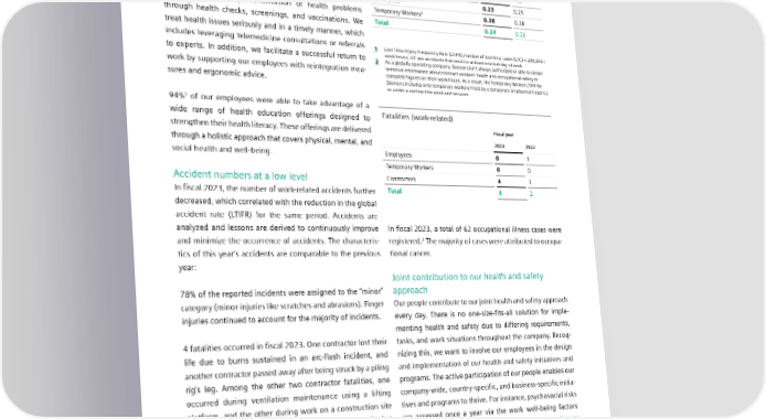 5.4 Occupational health and safety management Continuous expansion of health services We are continuously expanding our spectrum of health ser- LTIFR Employees and Temporary Workers¹ vices to support the resilience and health of our people at Fiscal year work and beyond. In fiscal 2023, 99%1 of our employees 2023 2022 have access to company medical care. This includes the Employees 0.23 0.25 prevention and early identification of health problems Temporary Workers² 0.30 0.38 through health checks, screenings, and vaccinations. We Total 0.24 0.26 treat health issues seriously and in a timely manner, which includes leveraging telemedicine consultations or referrals 1 Lost Time Injury Frequency Rate (LTIFR): number of lost-time cases (LTC) × 200,000 / to experts. In addition, we facilitate a successful return to work hours; LTC are accidents that result in at least one lost day of work. 2 As a globally operating company, Siemens isn’t always authorized or able to obtain work by supporting our employees with reintegration mea- sensitive information about contract workers‘ health and occupational safety or complete figures on their work hours. As a result, the Temporary Worker LTIFR for sures and ergonomic advice. Siemens includes only temporary workers hired by a temporary employment agency or under a contract for work and services. 1 94% of our employees were able to take advantage of a wide range of health education offerings designed to Fatalities (work-related) strengthen their health literacy. These offerings are delivered Fiscal year through a holistic approach that covers physical, mental, and 2023 2022 social health and well-being. Employees 0 1 Temporary Workers 0 0 Accident numbers at a low level Contractors 4 1 In fiscal 2023, the number of work-related accidents further Total 4 2 decreased, which correlated with the reduction in the global accident rate (LTIFR) for the same period. Accidents are analyzed and lessons are derived to continuously improve In fiscal 2023, a total of 62 occupational illness cases were and minimize the occurrence of accidents. The characteris- registered.2 The majority of cases were attributed to occupa- tics of this year’s accidents are comparable to the previous tional cancer. year: Joint contribution to our health and safety 78% of the reported incidents were assigned to the “minor” approach category (minor injuries like scratches and abrasions). Finger Our people contribute to our joint health and safety approach injuries continued to account for the majority of incidents. every day. There is no one-size-fits-all solution for imple- menting health and safety due to differing requirements, 4 fatalities occurred in fiscal 2023. One contractor lost their tasks, and work situations throughout the company. Recog- life due to burns sustained in an arc-flash incident, and nizing this, we want to involve our employees in the design another contractor passed away after being struck by a piling and implementation of our health and safety initiatives and rig’s leg. Among the other two contractor fatalities, one programs. The active participation of our people enables our occurred during ventilation maintenance using a lifting company-wide, country-specific, and business-specific initia- platform, and the other during work on a construction site tives and programs to thrive. For instance, psychosocial risks while using a mobile scaffold. Each incident and fatality is a are assessed once a year via the work well-being factors source of grief for the people concerned as well as their embedded in the Siemens Global Engagement Survey families, friends, and colleagues. Each incident is a renewed (SGES)1. The relevant teams then discuss and document the call for us to keep improving and ensuring a safe and healthy risks, opportunities, and measures, and outcomes in a struc- work environment for our people and partners. tured follow-up process. 1 Siemens without SHS. 2 Excluding temporary workers and contractors. SIEMENS SUSTAINABILITY REPORT 2023 101