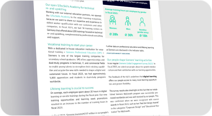 5.3 Professional education and lifelong learning Siemens AG in Germany allocated a total of €100 million for Average training hours per employee the Future Fund that will be invested over a period of four fiscal years starting in January 2019. The term of the Future Fund has now been extended to 2026. More than €3 million ∅ 30 training hours per employee. were approved for Future Fund projects in fiscal 2023, about €11 million less than in the previous year. Our open SiTecSkills Academy for technical Average training hours per employee by gender re- and upskilling in fiscal 2023: Working with our external education partners, we opened the SiTecSkills Academy to the wider learning ecosystem, because we want to share our expertise and experience in skilled worker qualification with our customers and other Women: Men: No/other companies. In fiscal 2023, we had 18 training centers in gender entry: Germany that offered about 200 trainings focused on technical ∅ 28h ∅ 30h ∅ 18h re- and upskilling, complemented by professional consulting and support. Vocational training to start your career Further data on professional education and lifelong learning With a dedicated in-house education institution for voca- at Siemens are disclosed in the indicator table. tional training – Siemens Professional Education (SPE) – OUR SUSTAINABLITY INDICATORS Siemens is one of the largest training companies for secondary school graduates. SPE offers apprenticeships and Our people shape Siemens’ learning activities dual-study programs in technical, IT, and commercial fields In our regular Siemens Global Engagement Survey (SGES)1 in to enable young talents to strengthen their existing capabil- fiscal 2023, we asked our people about the growth mindset ities and acquire the new skills needed to shape a digital and culture and their satisfaction with our learning opportunities. automated future. In fiscal 2023, we had approximately 5,800 apprentices and students in dual-study programs The feedback of the SGES underlines that digital learning worldwide. offers our people access to many more learning opportuni- ties and greater flexibility. Lifelong learning is crucial to success On average, each employee spent about 30 hours in digital The survey results also shed light on the fact that our estab- learning or on-site trainings during the fiscal year. Our new lished Siemens MyGrowth program was successfully pro- training opportunities and learning week promotions moted worldwide and was well-received by our people. This resulted in an increase in the number of training hours in was confirmed when we were recognized with several fiscal 2023. awards in fiscal 2023, such as two “Red Dot Design Awards” in the categories “Corporate Design” and “Educational Illus- In fiscal 2023, Siemens invested €237 million in our people’s tration” for MyGrowth. training, which corresponds to an average of €753 per employee. In total, we invested approximately €416 million We will continue to use the survey results to focus on in employee education and training. strategic learning and continuously shaping our portfolio of futureoriented learning opportunities. 1 Siemens without SHS. SIEMENS SUSTAINABILITY REPORT 2023 96