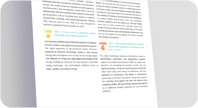 7.3 Our contribution to sustainable development of societies Goal 5 – Achieve gender equality and empower Goal 8 – Promote sustained, inclusive and sus- all women and girls tainable economic growth, full and productive employment, and decent work for all We firmly believe that promoting diversity in the workforce serves the interests of both society and Siemens itself. Siemens is committed globally to the New Normal Working Diversity reinforces our innovative strength, unleashes Model. Our aim with the new normal is for all our people employee potential, and directly contributes to our business around the world to be able to work on a mobile basis two to success. Our human resources management also supports a three days a week, wherever feasible and reasonable. Mobile transformation in top management, where there is room for working has many advantages for the individual and also for improvement. We are recruiting more women for top mana- the company: for instance, by ensuring that we are prepared gerial positions and are including more women in network- to respond flexibly during future crises. Our worldwide ing activities, trainings, and mentoring programs. Without business operations and our position as a thought leader SHS, Siemens aims to have 30% of its top management mean that in many countries we contribute toward the positions worldwide filled by women by 2025. growth of the gross domestic product (GDP). We are committed to offering attractive jobs and facilitating employment, and Goal 7 – Ensure access to affordable, reliable, we are encouraging the decoupling of economic growth sustainable, and modern energy for all from energy consumption. Our business portfolio covers the entire spectrum of applica- Goal 9 – Build resilient infrastructure, promote tions for modern smart grids and energy distribution systems. inclusive and sustainable industrialization, and The rapid expansion of decentralized energy structures foster innovation powered by Siemens technology creates a more diverse energy mix and improves the security of the energy supply. As a global technology company and innovation leader in The Internet of Things and data-based technologies foster electrification, automation, and digitalization, Siemens energy intelligence and pave the way toward a sustainable supports sustainable industrialization. With our engineering energy landscape. Our technologies facilitate access to expertise, our knowledge of numerous sectors, and our clean, reliable, low-carbon energy. digital technology, we help our business partners across the entire value chain, from design to production, and from operations to maintenance. We believe in international partnerships as the key to innovation. A large percentage of our customers and suppliers are small and medium-sized enterprises (SMEs). We have officially adopted sustainability as an additional strategic imperative for our investment decisions. SIEMENS SUSTAINABILITY REPORT 2023 134