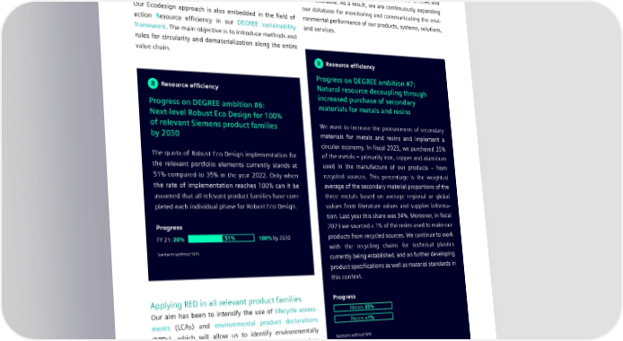 4.3 Product stewardship services. The implementation of this standard is the respon- products, systems, solutions, and services by 2030. In fiscal sibility of the heads of Siemens’ operating units and is an 2023, 65% of our third-party revenue was defined as rele- integral part of the company’s annual environmental review vant for our RED approach, compared to 57% in fiscal 2022. according to ISO 14001. In addition, our goal is to increase the number of LCAs and EPDs available. As a result, we are continuously expanding Targets our database for monitoring and communicating the envi- Our Ecodesign approach is also embedded in the field of ronmental performance of our products, systems, solutions, action Resource efficiency in our DEGREE sustainability and services. framework. The main objective is to introduce methods and rules for circularity and dematerialization along the entire value chain. R Resource efficiency Progress on DEGREE ambition #7: R Resource efficiency Natural resource decoupling through increased purchase of secondary Progress on DEGREE ambition #6: materials for metals and resins Next-level Robust Eco Design for 100% of relevant Siemens product families We want to increase the procurement of secondary by 2030 materials for metals and resins and implement a circular economy. In fiscal 2023, we purchased 35% The quota of Robust Eco Design implementation for of the metals – primarily iron, copper and aluminum the relevant portfolio elements currently stands at used in the manufacture of our products – from 51% compared to 35% in the year 2022. Only when recycled sources. This percentage is the weighted the rate of implementation reaches 100% can it be average of the secondary material proportions of the assumed that all relevant product families have com- three metals based on average regional or global - pleted each individual phase for Robust Eco Design. values from literature values and supplier informa tion. Last year this share was 34%. Moreover, in fiscal Progress 2023 we sourced < 1% of the resins used to make our FY 21: 26% 51% 100% by 2030 products from recycled sources. We continue to work Siemens without SHS with the recycling chains for technical plastics currently being established, and on further developing product specifications as well as material standards in this context. Applying RED in all relevant product families Progress Our aim has been to intensify the use of lifecycle assess- Metals 35% ments (LCAs) and environmental product declarations Resins