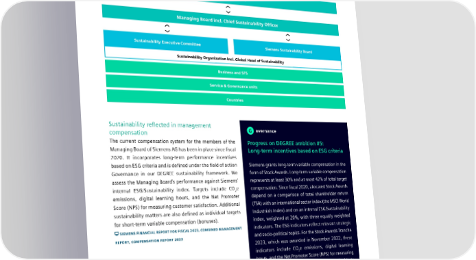 2.2 Sustainability governance and organization CEOs in businesses and lead countries are responsible for anchoring sustainability in their organizations Overview of roles and responsibilities Supervisory Board Managing Board incl. Chief Sustainability Officer Sustainability Executive Committee Siemens Sustainability Board Sustainability Organization incl. Global Head of Sustainability Business and SFS Service & Governance units Countries Sustainability reflected in management G overnance compensation The current compensation system for the members of the Progress on DEGREE ambition #5: Managing Board of Siemens AG has been in place since fiscal Long-term incentives based on ESG criteria 2020. It incorporates long-term performance incentives based on ESG criteria and is defined under the field of action Siemens grants long-term variable compensation in the Governance in our DEGREE sustainability framework. We form of Stock Awards. Long-term variable compensation assess the Managing Board’s performance against Siemens’ represents at least 30% and at most 42% of total target internal ESG/Sustainability index. Targets include CO2e compensation. Since fiscal 2020, allocated Stock Awards emissions, digital learning hours, and the Net Promoter depend on a comparison of total shareholder return Score (NPS) for measuring customer satisfaction. Additional (TSR) with an international sector index (the MSCI World sustainability matters are also defined as individual targets Industrials Index) and on an internal ESG/Sustainability for short-term variable compensation (bonuses). index, weighted at 20%, with three equally weighted SIEMENS FINANCIAL REPORT FOR FISCAL 2023, COMBINED MANAGEMENT indicators. The ESG indicators reflect relevant strategic REPORT, COMPENSATION REPORT 2023 and socio-political topics. For the Stock Awards Tranche 2023, which was awarded in November 2022, these indicators include CO e emissions, digital learning 2 hours, and the Net Promoter Score (NPS) for measuring customer satisfaction. These criteria are applicable to Managing Board members of Siemens AG and all senior managers globally who are eligible for Stock Awards. Progress ESG criteria anchored Siemens without SHS SIEMENS SUSTAINABILITY REPORT 2023 25