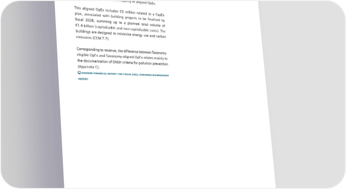 4.4 EU taxonomy The majority of eligible and/or aligned expenditures relate to processes and assets associated with the economic activities described for the revenue KPI: (i) Manufacture of low-carbon technologies for transport (CCM 3.3) and (ii) rail transportation infrastructure (CCM 6.14). These two activities account for half of eligible OpEx and the majority of aligned OpEx. This aligned OpEx includes €3 million related to a CapEx plan, associated with building projects to be finalized by fiscal 2028, summing up to a planned total volume of €1.4 billion (capitalizable and non-capitalizable costs). The buildings are designed to minimize energy use and carbon emissions (CCM 7.7). Corresponding to revenue, the difference between Taxonomy- eligible OpEx and Taxonomy-aligned OpEx relates mainly to the documentation of DNSH criteria for pollution prevention (Appendix C). SIEMENS FINANCIAL REPORT FOR FISCAL 2023, COMBINED MANAGEMENT REPORT SIEMENS SUSTAINABILITY REPORT 2023 80