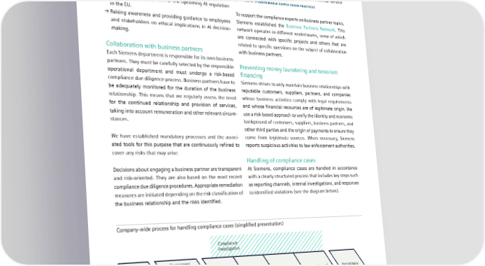 3.1 Compliance and ethics Our commitment to ethical standards is demonstrated by Both business partners and suppliers are required to sign a integrating AI ethics into all our business processes, products, code of conduct. In addition, depending on their risk classi- and solutions. This includes: fication, audits can be conducted on the business partners’ premises by the Siemens audit function or external service → Applying generally accepted and trustworthy AI frameworks providers. SUSTAINABLE SUPPLY CHAIN PRACTICES to AI tools in anticipation of the upcoming AI regulation in the EU. To support the compliance experts on business partner topics, → Raising awareness and providing guidance to employees Siemens established the Business Partners Network. This and stakeholders on ethical implications in AI decision- network operates in different workstreams, some of which making. are connected with specific projects and others that are related to specific questions on the subject of collaboration Collaboration with business partners with business partners. Each Siemens department is responsible for its own business partners. They must be carefully selected by the responsible Preventing money laundering and terrorism operational department and must undergo a risk-based financing compliance due diligence process. Business partners have to Siemens strives to only maintain business relationships with be adequately monitored for the duration of the business reputable customers, suppliers, partners, and companies relationship. This means that we regularly assess the need whose business activities comply with legal requirements for the continued relationship and provision of services, and whose financial resources are of legitimate origin. We taking into account remuneration and other relevant circum- use a risk-based approach to verify the identity and economic stances. background of customers, suppliers, business partners, and other third parties and the origin of payments to ensure they We have established mandatory processes and the associ- come from legitimate sources. When necessary, Siemens ated tools for this purpose that are continuously refined to reports suspicious activities to law enforcement authorities. cover any risks that may arise. Handling of compliance cases Decisions about engaging a business partner are transparent At Siemens, compliance cases are handled in accordance and risk-oriented. They are also based on the most recent with a clearly structured process that includes key steps such compliance due diligence procedures. Appropriate remediation as reporting channels, internal investigations, and responses measures are initiated depending on the risk classification of to identified violations (see the diagram below). the business relationship and the risks identified. Company-wide process for handling compliance cases (simplified presentation) Compliance investigation Assessment carried out by examining or Research Preparation of Disciplinary Allegation received evaluating the Mandating and planning Investigation the investigation measures and allegation before report remediation mandating an investigation SIEMENS SUSTAINABILITY REPORT 2023 35