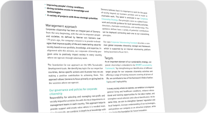 5.5 Corporate citizenship 5.5 Corporate citizenship – Improving people’s living conditions Siemens believes that it is important to work for the good – Giving societies access to knowledge and of society beyond our business activities and to invest in technologies charitable work. This belief is anchored in our Corporate – A variety of projects with three strategic priorities Citizenship Strategy. Our principles serve as a global frame- work and provide guidance for local sponsorship activities, donations, charitable contributions, and memberships. This Management approach guidance defines how a variety of potential contributions Corporate citizenship has been an integral part of Siemens can be deployed connecting each one to our overarching from the very beginning, with the aim to empower people principles. and societies. As defined by Werner von Siemens over 175 years ago, the company’s mission is to provide technol- Our own Corporate Volunteering Standard describes a com- ogies that improve quality of life and create lasting value for mon global corporate citizenship concept and framework society based on our portfolio, knowledge, and expertise. In which is supported by an internal volunteering platform alignment with this mission, our corporate citizenship pro- being launched in fiscal 2023. gram aims to positively impact society in every country where we operate through voluntary work. Targets As an important element of our sustainability strategy, cor- The foundation for our approach are the UN’s Sustainable porate citizenship is embedded in the DEGREE sustainability Development Goals. We identify key topics for our respective framework.1 By strengthening our identification of different countries, derive specific actions and illustrate how we are target groups for our corporate citizenship activities and making a positive contribution to achieving them. This offering a range of training measures covering all phases of approach allows Siemens to focus primarily on giving back to life, we contribute to two of the framework’s fields of action: the societies where we operate. Equity and Employability. Our governance and policies for corporate In every society where we operate, our ambition is to improve citizenship general living and healthcare conditions, enhance educa- Responsibility for selecting and managing non-profit and tional and training opportunities for the labor market, and socially impactful activities lies with the local departments or strengthen social cohesion and cultural identification. At the management teams in each country. This approach helps to same time, we aim to strengthen Siemens’ reputation and provide support and create value where it is needed most. local footprint, increase understanding of our technologies, Simultaneously, we combine in-depth local knowledge with and position our company as an attractive employer, while long-term commitment to overcome social challenges that also laying the foundation for future innovation. vary from region to region. Along with six other international Siemens foundations and Siemens Caring Hands e.V., the Siemens Stiftung comple- ments our corporate citizenship initiatives. WWW.SIEMENSSTIFTUNG.ORG/EN 1 Siemens without SHS. SIEMENS SUSTAINABILITY REPORT 2023 102