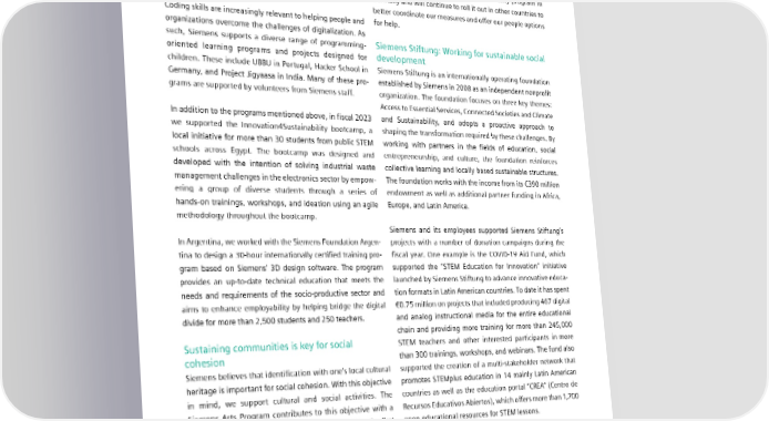 5.5 Corporate citizenship The promotion of education can take different forms and We are continuously striving to improve our impact on social pursue different objectives: However, the primary objective cohesion. A major challenge in recent years included unfore- remains consistent. We aim to provide enhanced equal seen events like the global pandemic and the war in Ukraine. access to future opportunities, and to give young people the To help those affected, we launched a charity program in tools to master future challenges. Germany and will continue to roll it out in other countries to better coordinate our measures and offer our people options Coding skills are increasingly relevant to helping people and for help. organizations overcome the challenges of digitalization. As such, Siemens supports a diverse range of programming- Siemens Stiftung: Working for sustainable social oriented learning programs and projects designed for development children. These include UBBU in Portugal, Hacker School in Siemens Stiftung is an internationally operating foundation Germany, and Project Jigyaasa in India. Many of these pro- established by Siemens in 2008 as an independent nonprofit grams are supported by volunteers from Siemens staff. organization. The foundation focuses on three key themes: Access to Essential Services, Connected Societies and Climate In addition to the programs mentioned above, in fiscal 2023 and Sustainability, and adopts a proactive approach to we supported the Innovation4Sustainability bootcamp, a shaping the transformation required by these challenges. By local initiative for more than 30 students from public STEM working with partners in the fields of education, social schools across Egypt. The bootcamp was designed and entrepreneurship, and culture, the foundation reinforces developed with the intention of solving industrial waste collective learning and locally based sustainable structures. management challenges in the electronics sector by empow- The foundation works with the income from its €390 million ering a group of diverse students through a series of endowment as well as additional partner funding in Africa, hands-on trainings, workshops, and ideation using an agile Europe, and Latin America. methodology throughout the bootcamp. Siemens and its employees supported Siemens Stiftung’s In Argentina, we worked with the Siemens Foundation Argen- projects with a number of donation campaigns during the tina to design a 30-hour internationally certified training pro- fiscal year. One example is the COVID-19 Aid Fund, which gram based on Siemens’ 3D design software. The program supported the “STEM Education for Innovation” initiative provides an up-to-date technical education that meets the launched by Siemens Stiftung to advance innovative educa- needs and requirements of the socio-productive sector and tion formats in Latin American countries. To date it has spent aims to enhance employability by helping bridge the digital €0.75 million on projects that included producing 467 digital divide for more than 2,500 students and 250 teachers. and analog instructional media for the entire educational chain and providing more training for more than 245,000 Sustaining communities is key for social STEM teachers and other interested participants in more cohesion than 300 trainings, workshops, and webinars. The fund also Siemens believes that identification with one’s local cultural supported the creation of a multi-stakeholder network that heritage is important for social cohesion. With this objective promotes STEMplus education in 14 mainly Latin American in mind, we support cultural and social activities. The countries as well as the education portal “CREA” (Centro de Siemens Arts Program contributes to this objective with a Recursos Educativos Abiertos), which offers more than 1,700 diverse range of projects: for example, support for the first open educational resources for STEM lessons. Namibian opera designed to promote intercultural under- standing. In addition, we help local communities create safe and stable environments. For instance, in fiscal 2023, we provided accommodations at our company premises in Warsaw to Ukrainian refugees. SIEMENS SUSTAINABILITY REPORT 2023 104