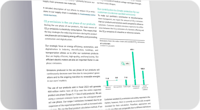 4.1 Climate action Upstream emissions Our Blue GIS portfolio is a prime example of our efforts to Our upstream emissions total roughly 11 million metric tons reduce emissions. The portfolio combines the advantages of of CO e and are therefore considerably higher than the gas-insulated switchgear with climate-friendly technologies. 2 emissions from our own business operations. This is because Using a fluorine-gas-free, non-toxic insulating gas reduces our supply chain operations are typically more energy- the CO e emissions of medium-voltage switchgear through- 2 intensive than our own operations – primarily because our out their entire lifespan. supply chain processes raw materials. Our contribution to climate protection for our A detailed description of our efforts to reduce CO e emis- customers (customer avoided emissions) 2 sions in our supply chain is available in SUSTAINABLE SUPPLY To make our portfolio’s contribution to decarbonization CHAIN PRACTICES. more transparent, we report the amount of CO e emissions 2 that our products and solutions avoid compared to reference CO2e emissions in the use phase of our products solutions. Customer avoided emissions represent the differ- During the use phase of our products, the main source of ence between the CO e emissions of a Siemens offering and 2 CO e emissions is electricity consumption. This means that the CO e emissions of a baseline or reference scenario. 2 2 the key strategies for reducing emissions during the product use phase aim at increasing energy efficiency and promoting automation and digitalization. Emissions from the value chain and avoided CO e emissions at customers 2 (in million t CO -equivalent) Our strategic focus on energy efficiency, automation, and 2 digitalization in industry, electrification, buildings, and 472.1 transportation allows us to offer our customers products that are highly efficient, high-quality, and long-lasting. Our efficient electric motors are also an important factor in use- phase emissions. ~41× Emissions produced in the use phase of our products will 189.9 continuously decrease over time due to new product gener- ations and to the ongoing transition to renewable energies 0.6 11.6 in our users’ markets. 11.0 The use of our products sold in fiscal 2023 will generate Upstream Own operations Cradle to gate Use phase and Avoided 469 million metric tons of CO e over the entire expected emissions investments emissions at 2 customers product use phase (Scope 3.11 Use of sold products). We are using a constant emission factor over the anticipated prod- uct use phase. Our scope 3 emissions increased due to an Customer avoided CO e emissions are widely reported in the 2 expansion of the reported portfolio as well as increased sales market; however, there is currently no universally accepted volumes. We use the final product calculation method. If we standard for their calculation. Therefore, approaches and applied the intermediate approach instead, emissions from results are often not comparable due to different definitions the use of our products sold in fiscal 2023 would be consid- and product portfolios. Siemens is actively involved in a erably lower. These emissions are primarily created by the number of working groups and associations that are working electricity used and the product’s lifespan. to support the standardization of calculations and reporting of customer-related CO2e emissions: for example, we are involved with the WBCSD and the EU Green Digital Coalition. SIEMENS SUSTAINABILITY REPORT 2023 62