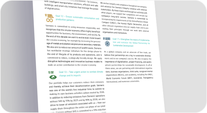 7.3 Our contribution to sustainable development of societies Goal 11 – Make cities and human settlements Goal 16 – Promote peaceful and inclusive societ- inclusive, safe, resilient, and sustainable ies for sustainable development, provide access to justice for all, and build effective, accountable, Siemens is a trusted partner for municipal governments and and inclusive institutions at all levels offers solutions across all infrastructure domains to make cities more efficient, sustainable, and resilient – for instance, We anchor integrity and compliance throughout our company with intelligent transportation solutions, efficient and safe and advance the Siemens Integrity Initiative with external buildings, and smart-city initiatives that leverage the power stakeholders. By these means and through our activities with of digitalization. other players, we support fair competition and ensure our company’s long-term success. Siemens is committed to Goal 12 – Ensure sustainable consumption and incorporating the requirements of the United Nations Global production patterns Compact (UNGC), the Human Rights Declaration, and all other relevant regulations into our supply chain and to pro- Siemens is committed to using resources responsibly and moting their principles through our work with external recognizes that the circular economy offers highly beneficial organizations and institutions. opportunities for business, the environment, and society. By the end of this decade we want to evolve even more toward Goal 17 – Strengthen the means of implementa- the circular economy, for example by increasing the percent- tion and revitalize the Global Partnership for age of metals and plastics we procure as secondary materials. Sustainable Development We also aim to reduce our amount of landfill waste. Siemens has worldwide strategic initiatives for the design phase to As a global company and an advocate of free trade, we - the end of lifecycle of its products and operations, and is believe that partnerships are a key to sustainable develop committed to robust, ecologically friendly design. We apply ment and to our company’s success. We also recognize the disruptive technologies and innovative business models to importance of digitalization, project financing, and public- make an active contribution to the circular economy. private partnerships for sustainable development. In all of these areas, we are partnering with international organiza- Goal 13 – Take urgent action to combat climate tions, business organizations, think tanks, nongovernmental change and its impacts organizations (NGOs), and academia, including the UNGC, World Economic Forum (WEF), econsense, Transparency Our portfolio helps our customers reduce their emissions International, and numerous universities. and thereby achieve their decarbonization goals. Siemens was one of the world’s first industrial firms to commit to making its own business activities carbon neutral by 2030. In addition to reducing emissions from Siemens' operations without SHS by 55% by 2025 and by 90% by 2030, we also strive to lower all emissions associated with us – from our supply chain throughout the entire use phase of our prod- ucts. Siemens without SHS is committed to a 20% reduction in emissions in its supply chain by 2030 compared to 2020 and aims to achieve a CO neutral supply chain by 2050. 2 With its commitment to science-based targets, Siemens supports the goal of the Paris Climate Agreement to limit climate change to 1.5°C (Science-Based Target Initiative, including SHS). SIEMENS SUSTAINABILITY REPORT 2023 135
