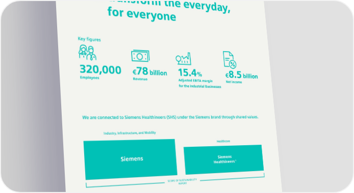 Our Purpose We create technology to transform the everyday, for everyone Key figures 320,000 €78 billion 15.4% €8.5 billion Employees Revenue Adjusted EBITA margin Net income for the Industrial Businesses We are connected to Siemens Healthineers (SHS) under the Siemens brand through shared values. Industry, Infrastructure, and Mobility Healthcare Siemens Siemens Healthineers1 SCOPE OF SUSTAINABILITY REPORT All indicators in the report include Siemens Healthineers (SHS), unless otherwise noted. For the sake of readability, the masculine form is used; it is representative of people of any gender. 1 Publicly listed subsidiary of Siemens; Siemens’ share in Siemens Healthineers: 75%. SIEMENS SUSTAINABILITY REPORT 2023 2