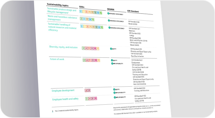 7.5 GRI Standards – key topics and boundaries Sustainability topics SDGs DEGREE GRI Standard Sustainable product design and R ESOURCE EFFICIENCY lifecycle management1 Waste and hazardous substance R ESOURCE EFFICIENCY GRI Standard 306 management Waste (2020) Sustainable handling of R ESOURCE EFFICIENCY GRI Standard 301 natural resources and material Materials efficiency GRI Standard 302 Energy GRI Standard 303 Water and Effluents (2018) GRI Standard 306 Waste (2020) Diversity, equity, and inclusion E QUITY GRI Standard 405 Diversity and Equal Opportunity GRI Standard 406 Non-Discrimination Future of work E QUITY GRI Standard 401 E MPLOYABILITY Employment GRI Standard 403 Occupational Health and Safety (2018) GRI Standard 404 Training and Education GRI Standard 405 Diversity and Equal Opportunity GRI Standard 406 Non Discrimination Employee development E QUITY GRI Standard 404 E MPLOYABILITY Training and Education Employee health and safety E MPLOYABILITY GRI Standard 403 Occupational Health and Safety (2018) 1 Top 2 material sustainability topics. Result of the assessment of organizational impacts (inside-out, i.e., on the environment and society), stakeholder relevance and business criticality (outside-in). The detailed GRI Standard Index 2021 is available on our Sustainability website. SIEMENS SUSTAINABILITY REPORT 2023 145