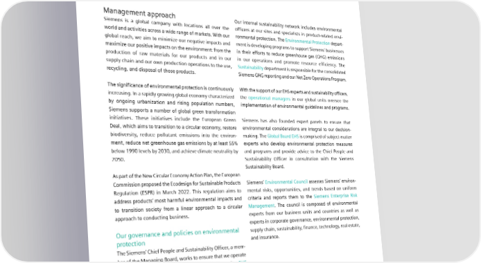 Holistic environmental protection Holistic environmental protection Management approach Our internal sustainability network includes environmental Siemens is a global company with locations all over the officers at our sites and specialists in product-related envi- world and activities across a wide range of markets. With our ronmental protection. The Environmental Protection depart- global reach, we aim to minimize our negative impacts and ment is developing programs to support Siemens’ businesses maximize our positive impacts on the environment: from the in their efforts to reduce greenhouse gas (GHG) emissions production of raw materials for our products and in our in our operations and promote resource efficiency. The supply chain and our own production operations to the use, Sustainability department is responsible for the consolidated recycling, and disposal of those products. Siemens GHG reporting and our Net Zero Operations Program. The significance of environmental protection is continuously With the support of our EHS experts and sustainability officers, increasing. In a rapidly growing global economy characterized the operational managers in our global units oversee the by ongoing urbanization and rising population numbers, implementation of environmental guidelines and programs. Siemens supports a number of global green transformation initiatives. These initiatives include the European Green Siemens has also founded expert panels to ensure that Deal, which aims to transition to a circular economy, restore environmental considerations are integral to our decision- biodiversity, reduce pollutant emissions into the environ- making. The Global Board EHS is comprised of subject-matter ment, reduce net greenhouse gas emissions by at least 55% experts who develop environmental protection measures below 1990 levels by 2030, and achieve climate neutrality by and programs and provide advice to the Chief People and 2050. Sustainability Officer in consultation with the Siemens Sustainability Board. As part of the New Circular Economy Action Plan, the European Commission proposed the Ecodesign for Sustainable Products Siemens’ Environmental Council assesses Siemens’ environ- Regulation (ESPR) in March 2022. This regulation aims to mental risks, opportunities, and trends based on uniform address products’ most harmful environmental impacts and criteria and reports them to the Siemens Enterprise Risk to transition society from a linear approach to a circular Management. The council is composed of environmental approach to conducting business. experts from our business units and countries as well as experts in corporate governance, environmental protection, Our governance and policies on environmental supply chain, sustainability, finance, technology, real estate, protection and insurance. The Siemens’ Chief People and Sustainability Officer, a mem- ber of the Managing Board, works to ensure that we operate in compliance with our environmental guidelines. Our EHS Principles serve as internal binding guidelines for this purpose. SIEMENS SUSTAINABILITY REPORT 2023 55