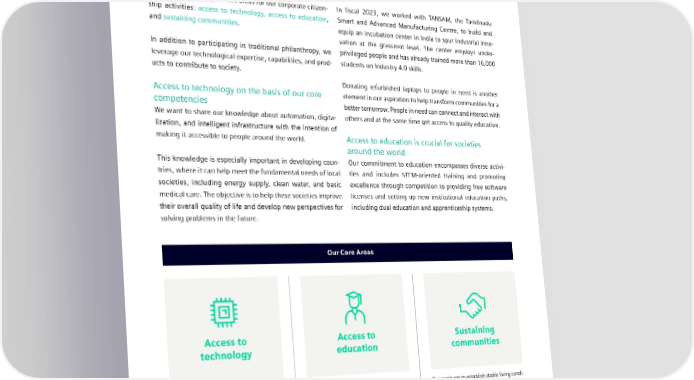 5.5 Corporate citizenship Actions and results In addition, by equipping research laboratories with control and automation equipment in countries like Hungary, Turkey, Scale sustainability impact with a shared value and Latvia, Siemens is helping improve educational and approach employment opportunities. Grounded in our core business and competencies, we have defined three strategic focus areas for our corporate citizen- In fiscal 2023, we worked with TANSAM, the Tamilnadu ship activities: access to technology, access to education, Smart and Advanced Manufacturing Centre, to build and and sustaining communities. equip an incubation center in India to spur industrial inno- vation at the grassroot level. The center employs under- In addition to participating in traditional philanthropy, we privileged people and has already trained more than 16,000 leverage our technological expertise, capabilities, and prod- students on Industry 4.0 skills. ucts to contribute to society. Donating refurbished laptops to people in need is another Access to technology on the basis of our core element in our aspiration to help transform communities for a competencies better tomorrow. People in need can connect and interact with We want to share our knowledge about automation, digita- others and at the same time get access to quality education. lization, and intelligent infrastructure with the intention of making it accessible to people around the world. Access to education is crucial for societies around the world This knowledge is especially important in developing coun- Our commitment to education encompasses diverse activi- tries, where it can help meet the fundamental needs of local ties and includes STEM-oriented training and promoting societies, including energy supply, clean water, and basic excellence through competition to providing free software medical care. The objective is to help these societies improve licenses and setting up new institutional education paths, their overall quality of life and develop new perspectives for including dual education and apprenticeship systems. solving problems in the future. Our Core Areas Access to Access to Sustaining technology education communities With the aid of our core competencies in Knowledge is a resource on which our future Our goals are to establish stable living condi- digitalization, automation, and electrifica- depends. Therefore, improving educational tions, protect values, unleash creativity, tion, as well as scientific research, we strive prospects and allowing broad access to improve intercultural understanding, and to give as many people as possible the education are critically important challenges contribute to progress. chance to use the latest technologies. for all societies everywhere in the world. SIEMENS SUSTAINABILITY REPORT 2023 103