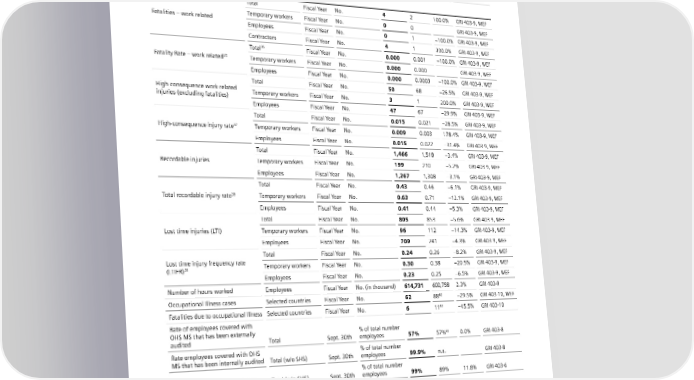 6 Our sustainability indicators Sustainability Key Performance Indicators Fiscal Year/ (KPIs) September 30th Unit FY 2023 FY 2022 +/– Standards Siemens Graduate Program (SGP) Total community Sept. 30th No. 954 913 4.5% GRI 404-2, WEF Active participants Sept. 30th No. 132 99 33.3% GRI 404-2, WEF Occupational health & safety34 Total Fiscal Year No. 4 2 100.0% GRI 403-9, WEF Fatalities – work related Temporary workers Fiscal Year No. 0 0 GRI 403-9, WEF Employees Fiscal Year No. 0 1 −100.0% GRI 403-9, WEF Contractors Fiscal Year No. 4 1 300.0% GRI 403-9, WEF Total36 Fiscal Year No. 0.000 0.001 –100.0% GRI 403-9, WEF Fatality Rate – work related35 Temporary workers Fiscal Year No. 0.000 0.000 GRI 403-9, WEF Employees Fiscal Year No. 0.000 0.0003 −100.0% GRI 403-9, WEF Total Fiscal Year No. 50 68 −26.5% GRI 403-9, WEF High-consequence work-related Temporary workers Fiscal Year No. 3 1 200.0% GRI 403-9, WEF injuries (excluding fatalities) Employees Fiscal Year No. 47 67 −29.9% GRI 403-9, WEF Total Fiscal Year No. 0.015 0.021 –28.5% GRI 403-9, WEF High-consequence injury rate37 Temporary workers Fiscal Year No. 0.009 0.003 178.4% GRI 403-9, WEF Employees Fiscal Year No. 0.015 0.022 –31.4% GRI 403-9, WEF Total Fiscal Year No. 1,466 1,518 −3.4% GRI 403-9, WEF Recordable injuries Temporary workers Fiscal Year No. 199 210 −5.2% GRI 403-9, WEF Employees Fiscal Year No. 1,267 1,308 −3.1% GRI 403-9, WEF Total Fiscal Year No. 0.43 0.46 –6.1% GRI 403-9, WEF Total recordable injury rate38 Temporary workers Fiscal Year No. 0.63 0.71 –12.1% GRI 403-9, WEF Employees Fiscal Year No. 0.41 0.44 –5.3% GRI 403-9, WEF Total Fiscal Year No. 805 853 −5.6% GRI 403-9, WEF Lost time injuries (LTI) Temporary workers Fiscal Year No. 96 112 −14.3% GRI 403-9, WEF Employees Fiscal Year No. 709 741 −4.3% GRI 403-9, WEF Total Fiscal Year No. 0.24 0.26 −8.2% GRI 403-9, WEF Lost time injury frequency rate Temporary workers Fiscal Year No. 0.30 0.38 −20.5% GRI 403-9, WEF (LTIFR)39 Employees Fiscal Year No. 0.23 0.25 −6.5% GRI 403-9, WEF Number of hours worked Employees Fiscal Year No. (in thousand) 614,731 600,758 2.3% GRI 403-9 Occupational Illness cases Selected countries Fiscal Year No. 62 8840 −29.5% GRI 403-10, WEF Fatalities due to occupational Illness Selected countries Fiscal Year No. 6 1140 –45.5% GRI 403-10 Rate of employees covered with OHS MS that has been externally % of total number audited Total Sept. 30th employees 57% 57%41 0.0% GRI 403-8 Rate employees covered with OHS % of total number MS that has been internally audited Total (w/o SHS) Sept. 30th employees 99.9% n.a. GRI 403-8 % of total number Rate of access to Medical Care42 Total (w/o SHS) Sept. 30th employees 99% 89% 11.8% GRI 403-6 % of total number Rate of access to Health Education42 Total (w/o SHS) Sept. 30th employees 94% 85% 11.0% 34 Excluding CTSI Oncology Solutions. 35 Number of Fatalities x 200,000 / working hours. 36 Fatality Rate w/o contractors. 37 Number of High-consequence injuries x 200,000 / working hours. 38 Number of Recordable injuries x 200,000 / working hours. 39 Number of Lost Time Cases (LTC) x 200,000 / working hours. LTC are accidents that results in at least one lost working day. 40 Due to system change of German Statutory Agency adjusted prior year figures. 41 Realignment due to calculation error in last year. 42 Scope of HM Reporting: Countries >30 employees as well as affiliated companies >30 employees. SIEMENS SUSTAINABILITY REPORT 2023 122