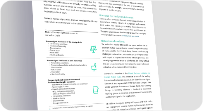 3.2 Human rights These initiatives have been incorporated into our internal Compliance, and Environment, Health, and Safety (EHS). In guidelines and policies. They have also led to the creation of fiscal 2023, we revised the mandatory BCG training for our customized roles and responsibilities within our key functions, people and included specifics on fundamental rights at work. our businesses, and our regions. As part of our commitment to responsible business conduct, we have piloted the process External and internal expert dialogs and regular knowledge- of environmental, social, and human rights deep-dive due sharing are also conducted in the area of environmental diligence that will be conducted annually for established key and social risks: for example, on responsible business due business partners and strategic partners. This process has diligence in conflict regions. been piloted in fiscal 2023 and will become mandatory beginning in fiscal 2024. Grievance mechanism and channels Siemens offers protected channels for reporting violations of Material human rights risks that we have identified in our external and internal rules to all our people and external value chain are summarized in the table below. third parties. The reports generated by these channels are forwarded to our Compliance organization and followed up. The same channels can also be used to report human rights Material human rights risk issues in violations to the company. COMPLIANCE AND ETHICS our value chain Networks and coalitions Human rights risk issues in the supply chain We maintain a regular dialog with our peers, and we aim to › Fair working conditions › Freedom of assembly establish mutual trust and drive a more in-depth discussion › Discrimination on human rights. This kind of dialog focuses on discussing › Forced labor › Child labor challenges and solutions, addressing areas of improvement › Health and safety with regard to responsible business conduct practices, and Human rights risk issues in own workforce identifying potential areas to join forces. We firmly believe › Fair working conditions that we can achieve faster, more impactful progress through › Freedom of association and collective bargaining › Discrimination collective action compared to acting alone. › Forced labor › Child labor › Health and safety Siemens is a member of the Global Business Initiative on Human rights risk issues in the case of Human Rights (GBI). This initiative is one of the leading business decisions by customers international network initiatives in the field of human rights. 1 › Business-specific environmental and social risks Siemens is also represented in the UN Global Compact Net- › Country-specific risks work’s European Business and Human Rights Peer Learning › Impacts on local communities (e.g., Indigenous population, 2 ethnic or religious minorities) Group. In Germany, Siemens is involved in econsense › Fair working conditions working groups in the areas of business and human rights › Modern slavery and human rights in the supply chain. › Discrimination › Occupied territories 1 Including in the areas of coal, oil, and gas and mining, for example. In addition to regular dialogs with peers and think tanks, we engage with external human rights advisors to derive responsible risk mitigation pathways, training and capacity- Training and skill building building methods, and ways to strengthen due diligence Our continuous skill building activities are geared toward practices. In addition, we engage with investors, sharehold- specific target groups. Siemens provides interactive training ers, customers, journalists, rating agencies, and NGOs. formats for employees, suppliers, and global and regional salespeople and for specific functions like Sustainability, 2 econsense is a forum for the sustainable development of German business. SIEMENS SUSTAINABILITY REPORT 2023 43