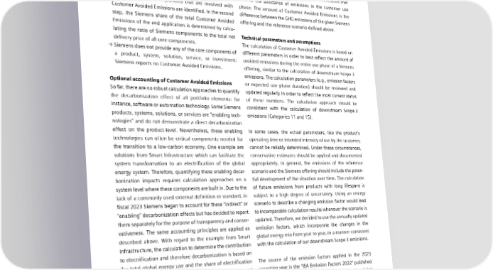 7.2 Reporting principles for Customer Avoided Emissions → Siemens provides all core component(s), even if they only Calculation represent intermediate products of an end application: Siemens Businesses and SFS are required, where applicable, Siemens accounts for 100% of the Customer Avoided to report Customer Avoided Emissions associated with all Emissions during the customer use phase. products, systems, solutions, services, or investments that → Siemens provides some of the core component(s): In the lead to the avoidance of emissions in the customer use first step, all core components that are involved with phase. The amount of Customer Avoided Emissions is the Customer Avoided Emissions are identified. In the second difference between the GHG emissions of the given Siemens step, the Siemens share of the total Customer Avoided offering and the reference scenario defined above. Emissions of the end application is determined by calcu- lating the ratio of Siemens components to the total net Technical parameters and assumptions delivery price of all core components. The calculation of Customer Avoided Emissions is based on → Siemens does not provide any of the core components of different parameters in order to best reflect the amount of a product, system, solution, service, or investment: avoided emissions during the entire use phase of a Siemens Siemens reports no Customer Avoided Emissions. offering, similar to the calculation of downstream Scope 3 emissions. The calculation parameters (e.g., emission factors Optional accounting of Customer Avoided Emissions or expected use phase duration) should be reviewed and So far, there are no robust calculation approaches to quantify updated regularly in order to reflect the most current status the decarbonization effect of all portfolio elements: for of these numbers. The calculation approach should be instance, software or automation technology. Some Siemens consistent with the calculation of downstream Scope 3 products, systems, solutions, or services are “enabling tech- emissions (Categories 11 and 15). nologies” and do not demonstrate a direct decarbonization effect on the product-level. Nevertheless, these enabling In some cases, the actual parameters, like the product’s technologies can often be critical components needed for operating time or intended intensity of use by the customer, the transition to a low-carbon economy. One example are cannot be reliably determined. Under these circumstances, solutions from Smart Infrastructure which can facilitate the conservative estimates should be applied and documented system transformation to an electrification of the global appropriately. In general, the emissions of the reference energy system. Therefore, quantifying these enabling decar- scenario and the Siemens offering should include the poten- bonization impacts requires calculation approaches on a tial development of the situation over time. The calculation system level where these components are built in. Due to the of future emissions from products with long lifespans is lack of a commonly used external definition or standard, in subject to a high degree of uncertainty. Using an energy fiscal 2023 Siemens began to account for these “indirect” or scenario to describe a changing emission factor would lead “enabling” decarbonization effects but has decided to report to incomparable calculation results whenever the scenario is them separately for the purpose of transparency and conser- updated. Therefore, we decided to use the annually updated vativeness. The same accounting principles are applied as emission factors, which incorporate the changes in the described above. With regard to the example from Smart global energy mix from year to year, in a manner consistent Infrastructure, the calculation to determine the contribution with the calculation of our downstream Scope 3 emissions. to electrification and therefore decarbonization is based on the total global energy use and the share of electrification The source of the emission factors applied in the 2023 and automation solutions from Smart Infrastructure as part reporting year is the “IEA Emission Factors 2022” published of the total global investment in electrification. The eligible by the International Energy Agency. For example, the global revenue, based on the EU Taxonomy, is included in the CO2e emissions factor used for electricity generation only is calculation along with the grid mix evolution of electricity 461 g CO e/kWh. 2 generation. SIEMENS SUSTAINABILITY REPORT 2023 130