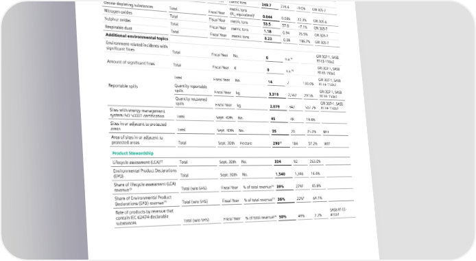 6 Our sustainability indicators Sustainability Key Performance Indicators Fiscal Year/ (KPIs) September 30th Unit FY 2023 FY 2022 +/– Standards Rate of sites with implemented water strategy Total Sept. 30th % of sites 96% 93% 3.8% GRI 303-1, WEF Atmospheric pollutant emissions Volatile Organic Compounds Total Fiscal Year metric tons 249.7 274.4 −9.0% GRI 305-7 metric tons 9 Ozone-depleting substances Total Fiscal Year (R11 equivalent) 0.044 0.036 22.3% GRI 305-6 Nitrogen oxides Total Fiscal Year metric tons 53.5 57.6 −7.1% GRI 305-7 Sulphur oxides Total Fiscal Year metric tons 1.18 0.94 25.5% GRI 305-7 Respirable dust Total Fiscal Year metric tons 0.23 0.08 186.7% GRI 305-7 Additional environmental topics Environment-related incidents with GRI 307-1, SASB significant fines Total Fiscal Year No. 0 n.a.10 RT-EE-150a2 GRI 307-1, SASB Amount of significant fines Total Fiscal Year € 0 n.a.10 RT-EE-150a2 GRI 307-1, SASB Total Fiscal Year No. 14 7 100.0% RT-EE-150a2 Reportable spills Quantity reportable GRI 307-1, SASB spills Fiscal Year kg 3,319 2,562 29.5% RT-EE-150a2 Quantity recovered GRI 307-1, SASB spills Fiscal Year kg 2,079 342 507.7% RT-EE-150a2 Sites with energy management system ISO 50001 certification Total Sept. 30th No. 45 38 18.4% Sites in or adjacent to protected areas Total Sept. 30th No. 25 20 25.0% WEF Area of sites in or adjacent to protected areas Total Sept. 30th Hectare 29011 184 57.2% WEF Product Stewardship Lifecycle assessment (LCA)12 Total Sept. 30th No. 334 92 263.0% Environmental Product Declarations (EPD) Total Sept. 30th No. 1,540 1,346 14.4% Share of lifecycle assessment (LCA) 13 14 8 revenue Total (w/o SHS) Fiscal Year % of total revenue 39% 27% 45.8% Share of Environmental Product 13 14 8 Declarations (EPD) revenue Total (w/o SHS) Fiscal Year % of total revenue 36% 22% 64.1% Rate of products by revenue that contain IEC 62474-declarable SASB RT-EE- 14 substances Total (w/o SHS) Fiscal Year % of total revenue 50% 49% 2.2% 410a1 8 Change in last year data caused by new calculation method. 9 R11 equivalent measures ozone depletion potential. 10 Change in last year data caused by new definition with threshold. 11 Therein 49 hectare of an office location without production in Erlangen/Germany. 12 Full-scale. 13 Based on 3rd party revenue with products. 14 Siemens without SHS. SIEMENS SUSTAINABILITY REPORT 2023 114